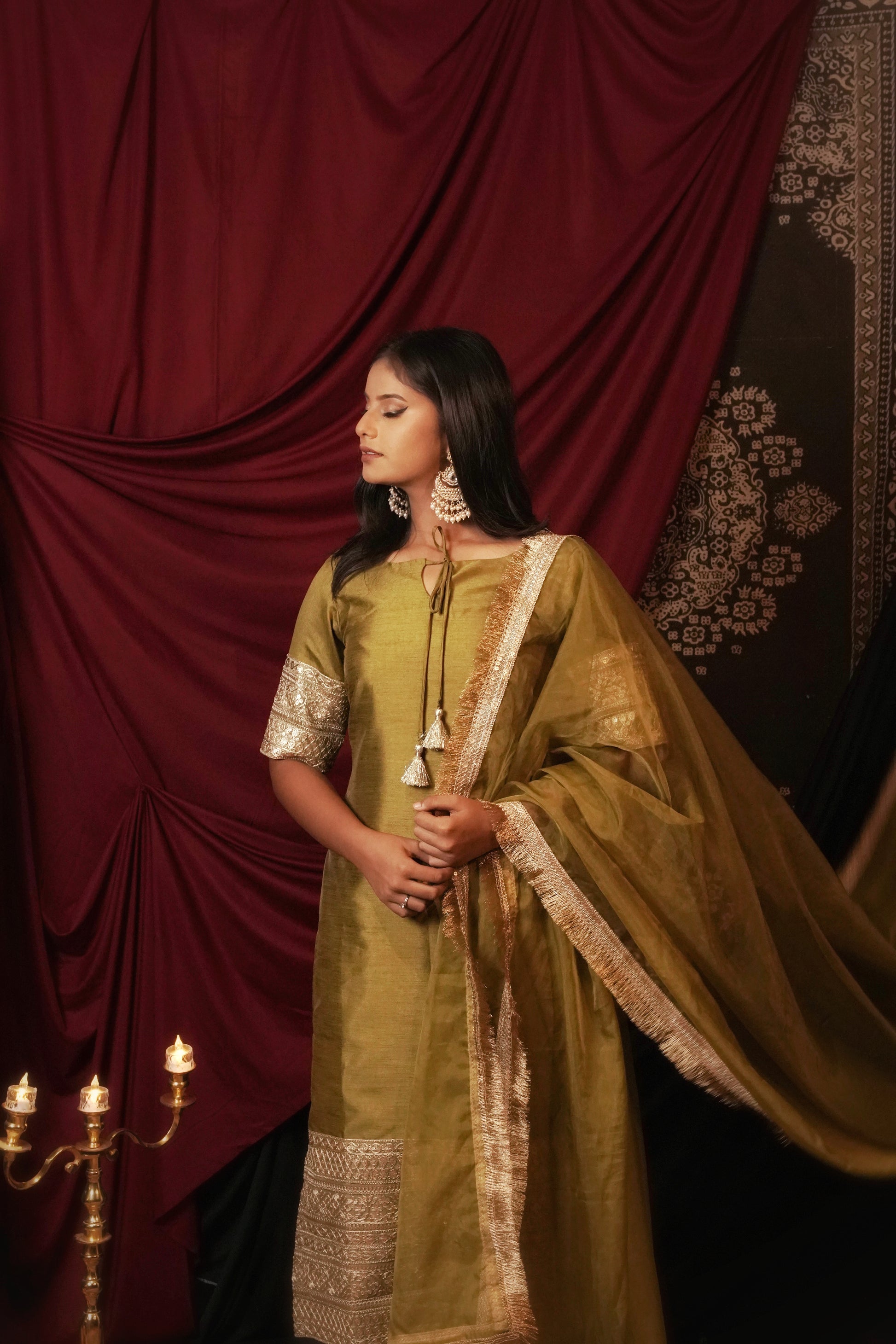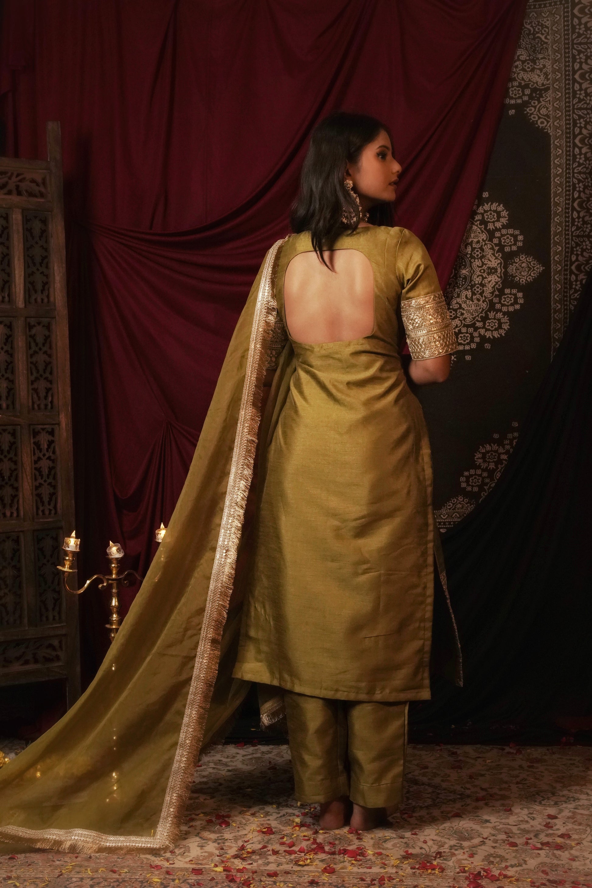 Step into timeless grace with our Aarunya (Mehendi) Suit Set. In an earthy mehendi green, this stunning ensemble showcases delicate zari and sequin work, adding a hint of shimmer to its refined design. The kurta, with intricate detailing, pairs effortlessly with straight-cut pants for a sleek silhouette. A matching dupatta, embellished with subtle accents, completes the look, offering an air of understated elegance."
