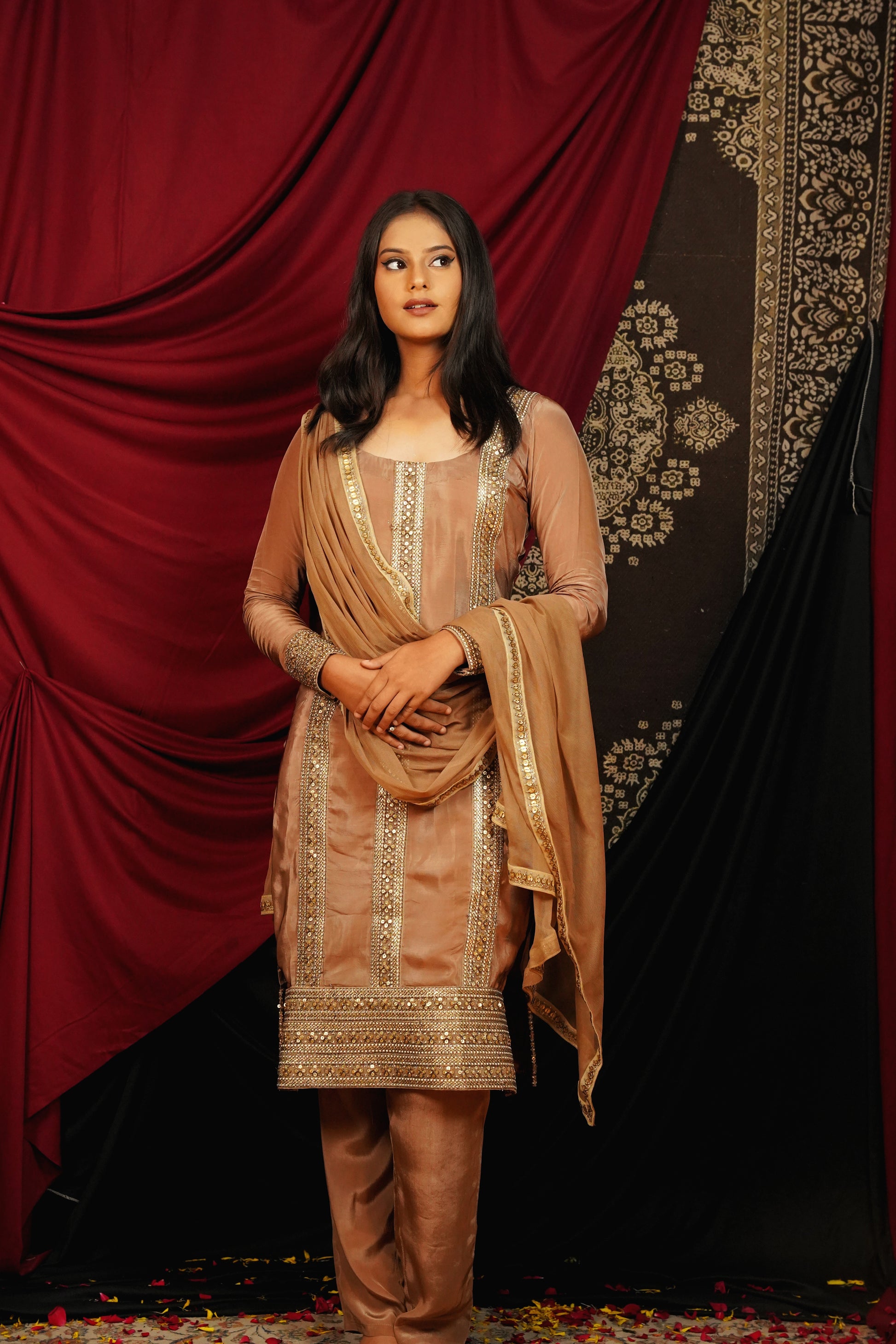 Unveil timeless elegance with our Advaita Suit Set, a celebration of classic charm in a rich brown hue. This ensemble features meticulous zari and sequin work, adding a subtle shimmer that enhances the beauty of the straight-cut kurta. Paired with tailored straight pants and a complementary dupatta, each piece is crafted with precision for a flawless fit and flow. Advaita blends traditional artistry with contemporary design, making it the perfect choice for those who seek understated sophistication and effortless grace this festive season.