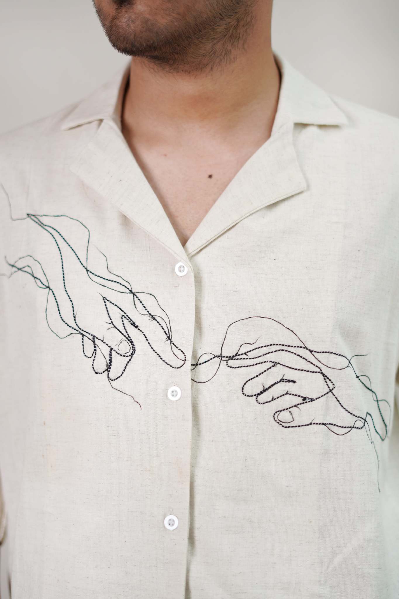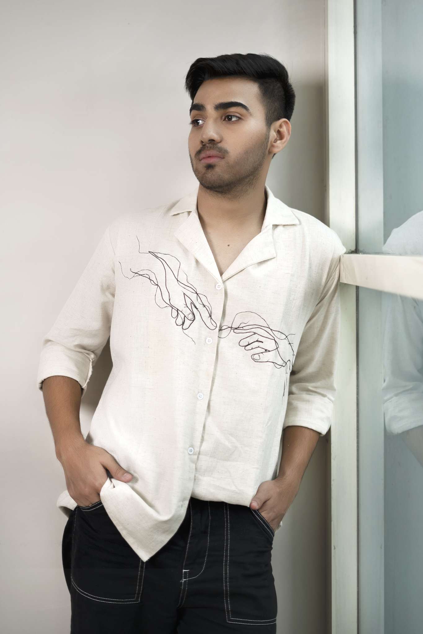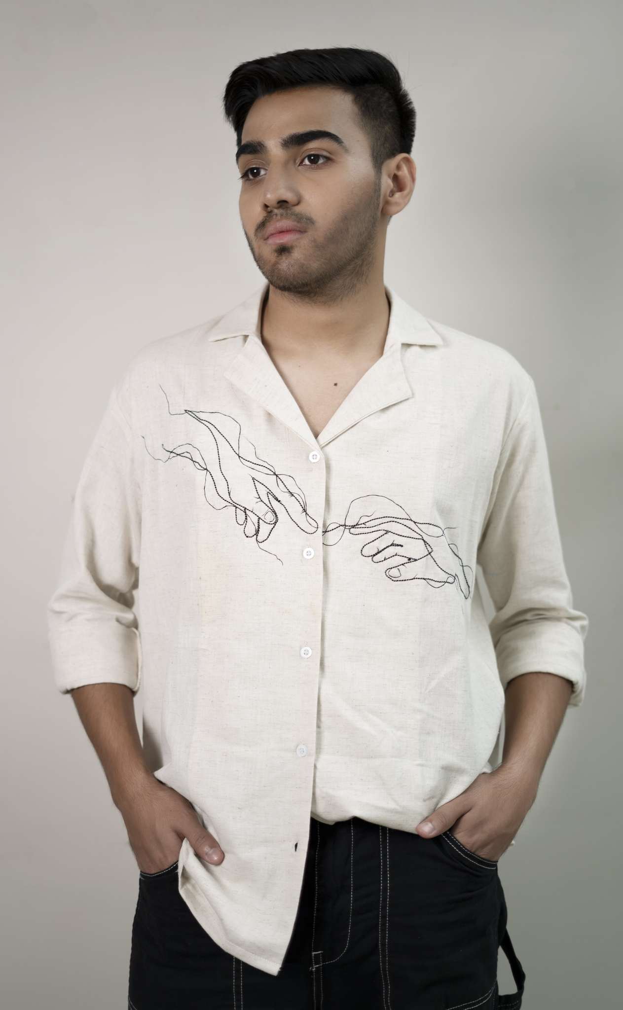 Adam and eve is a unisex shirt made with handloom linen fabric, the shirt has a micro notch collar with full sleeves with a line art motif at the across front derived from the creation of adam painting by michealangelo that makes statement on its own !