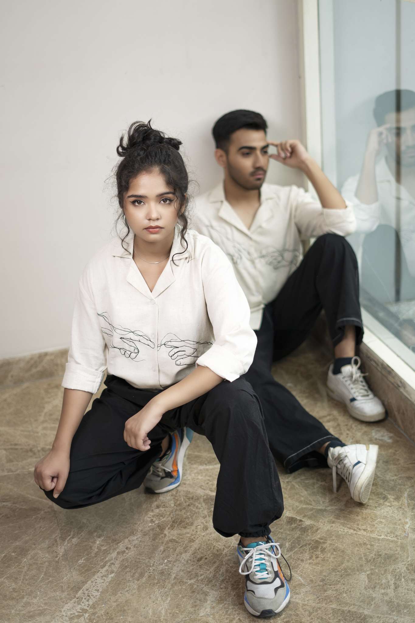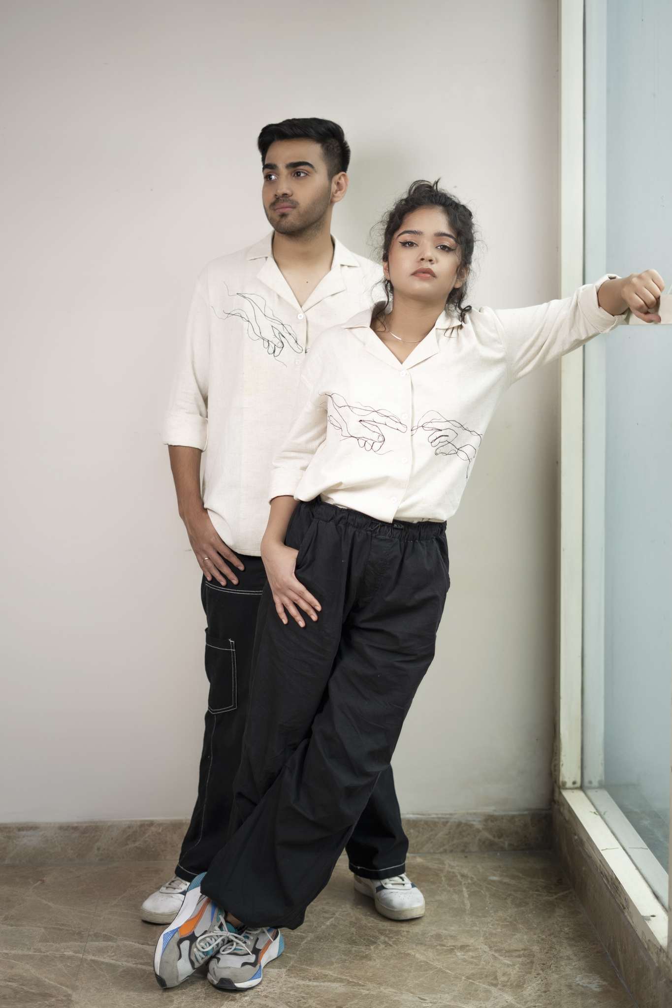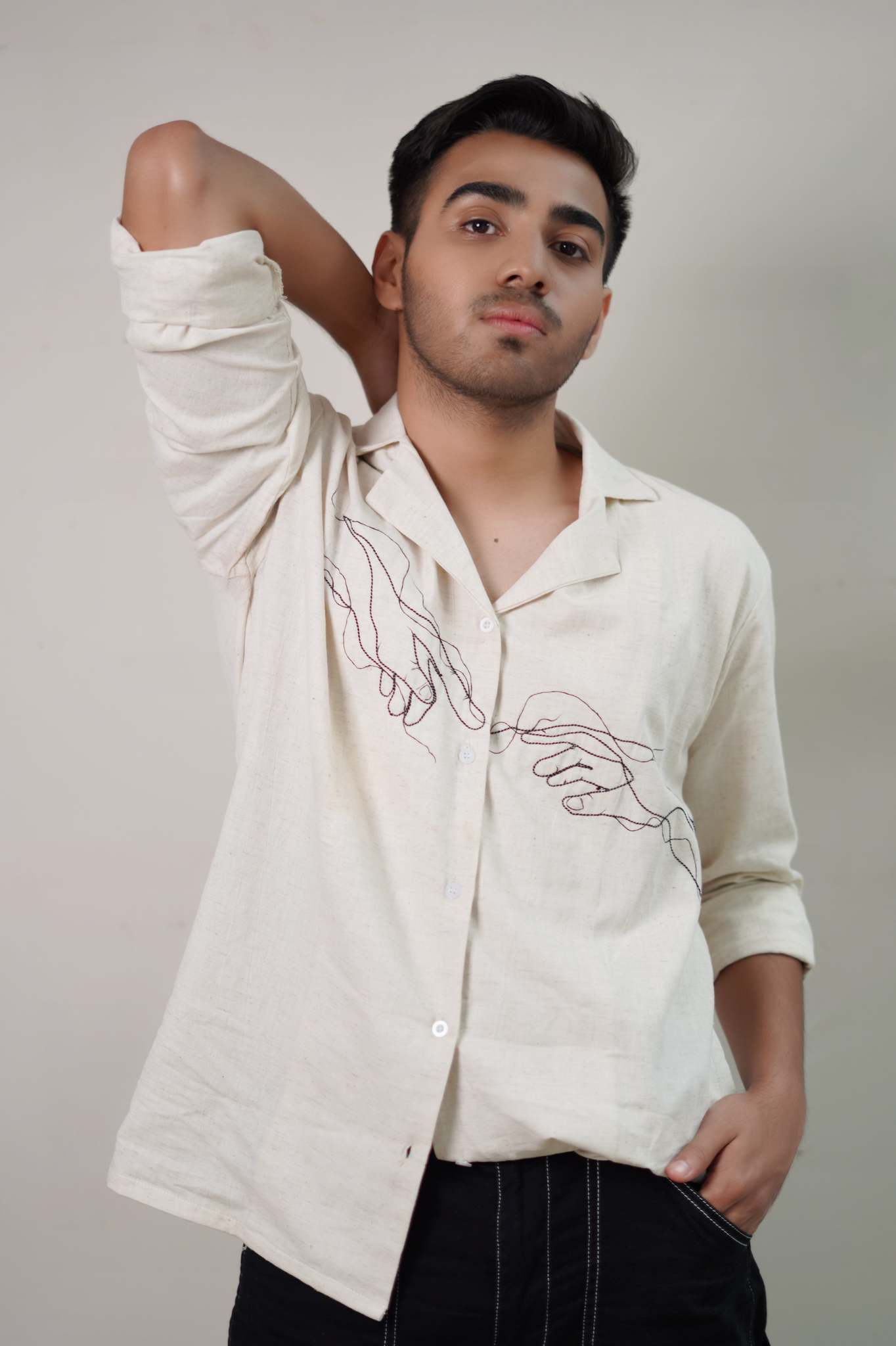 Adam and eve is a unisex shirt made with handloom linen fabric, the shirt has a micro notch collar with full sleeves with a line art motif at the across front derived from the creation of adam painting by michealangelo that makes statement on its own !