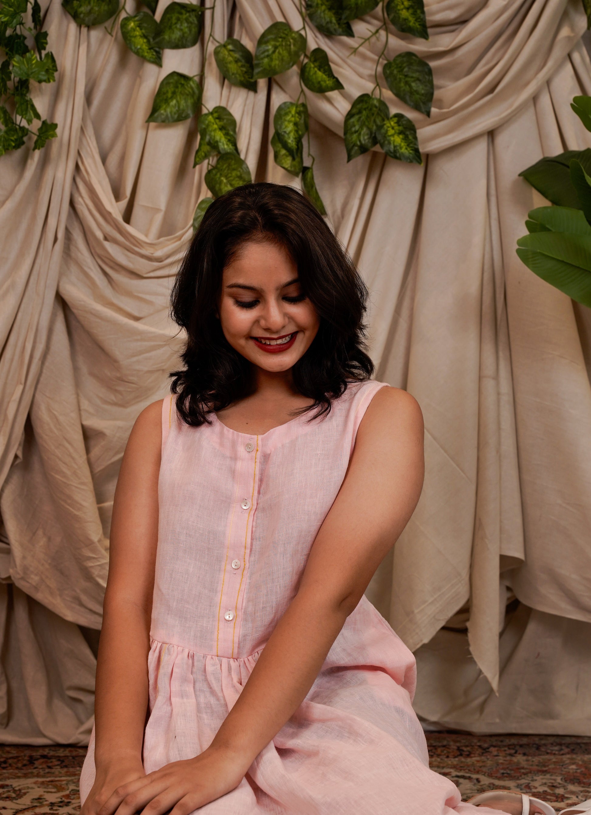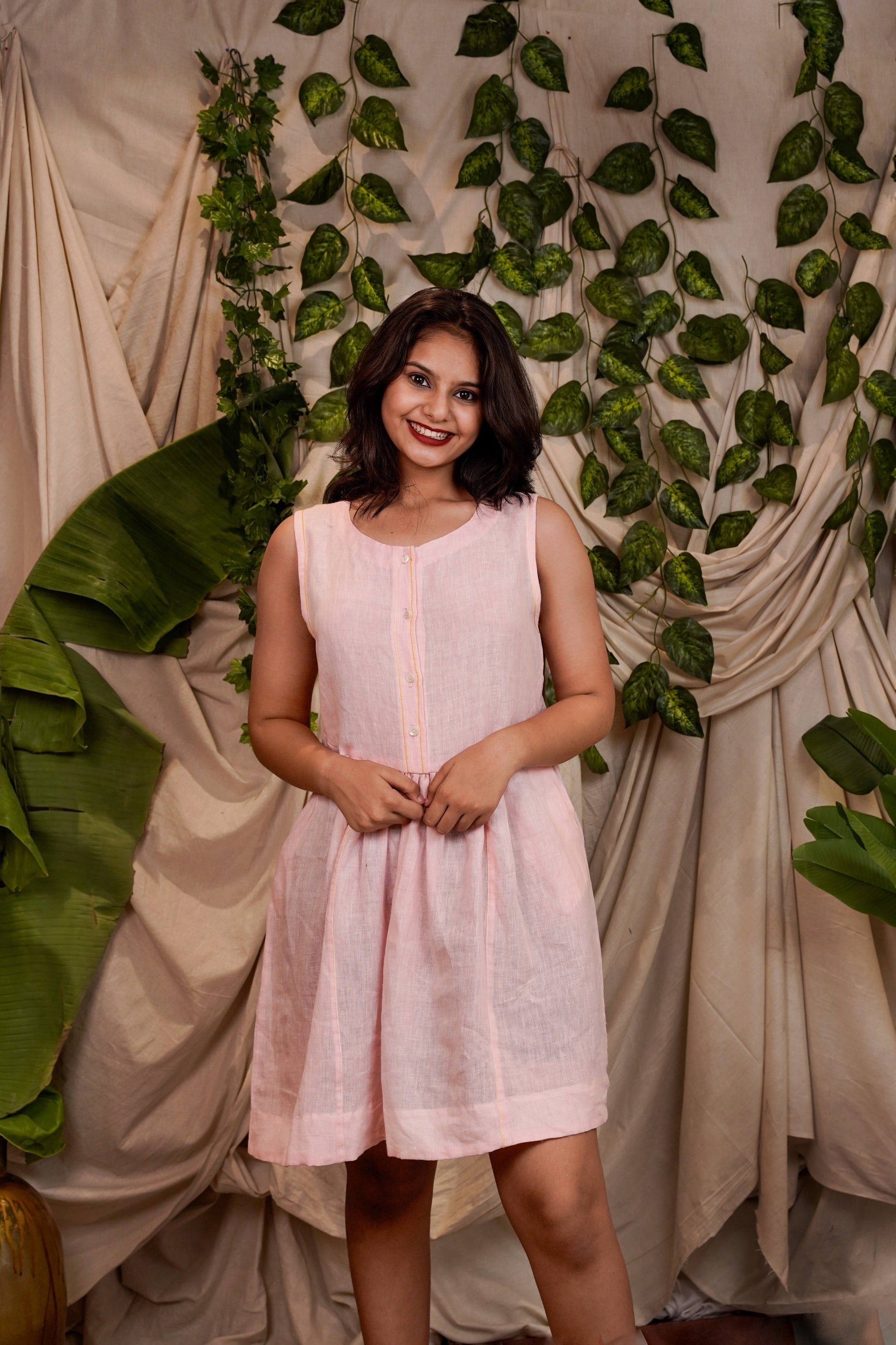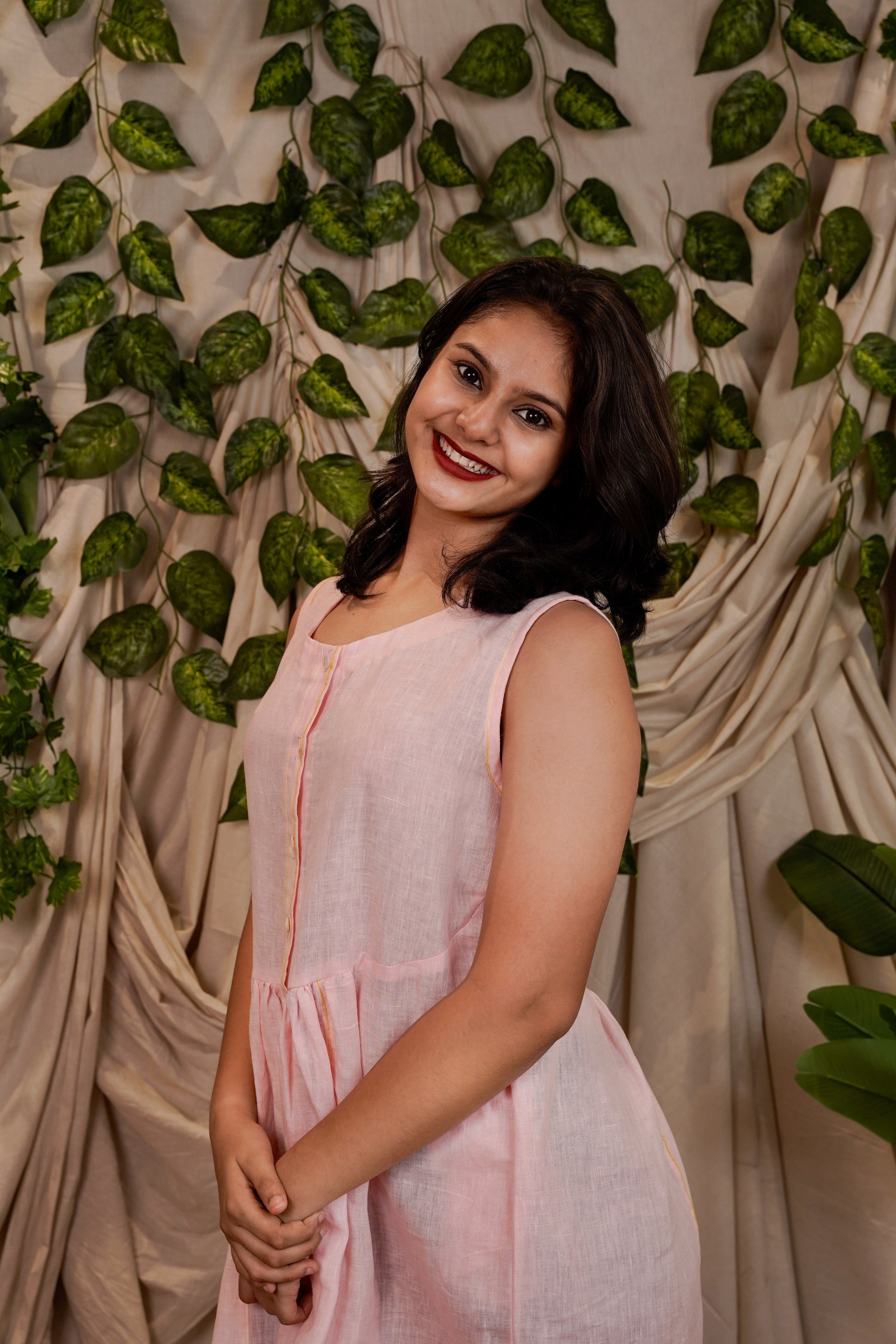 Blush blossom is the spring in coming personified ! Its a soft pink dress with intricate gathers and a touch of warmth with its embroidery details to make you feel like the new flower of a fresh spring morning. The dress features a button down neckline with shell buttons and every girl's dream to have in a dress- Pockets.