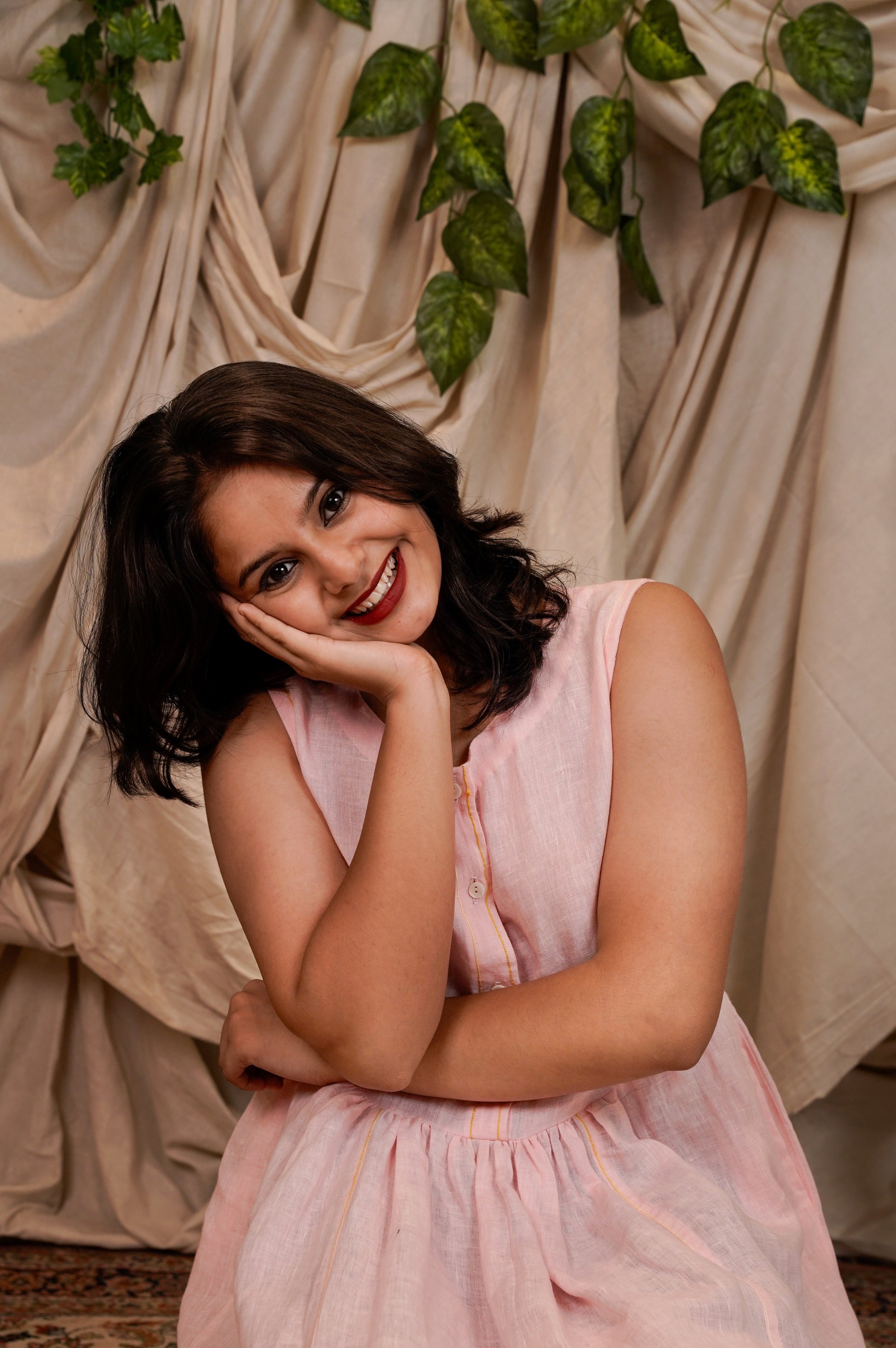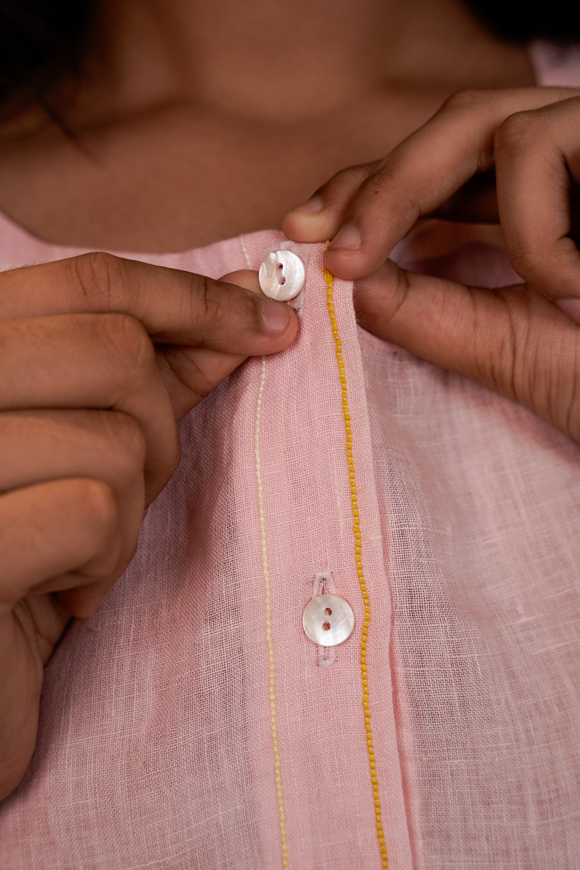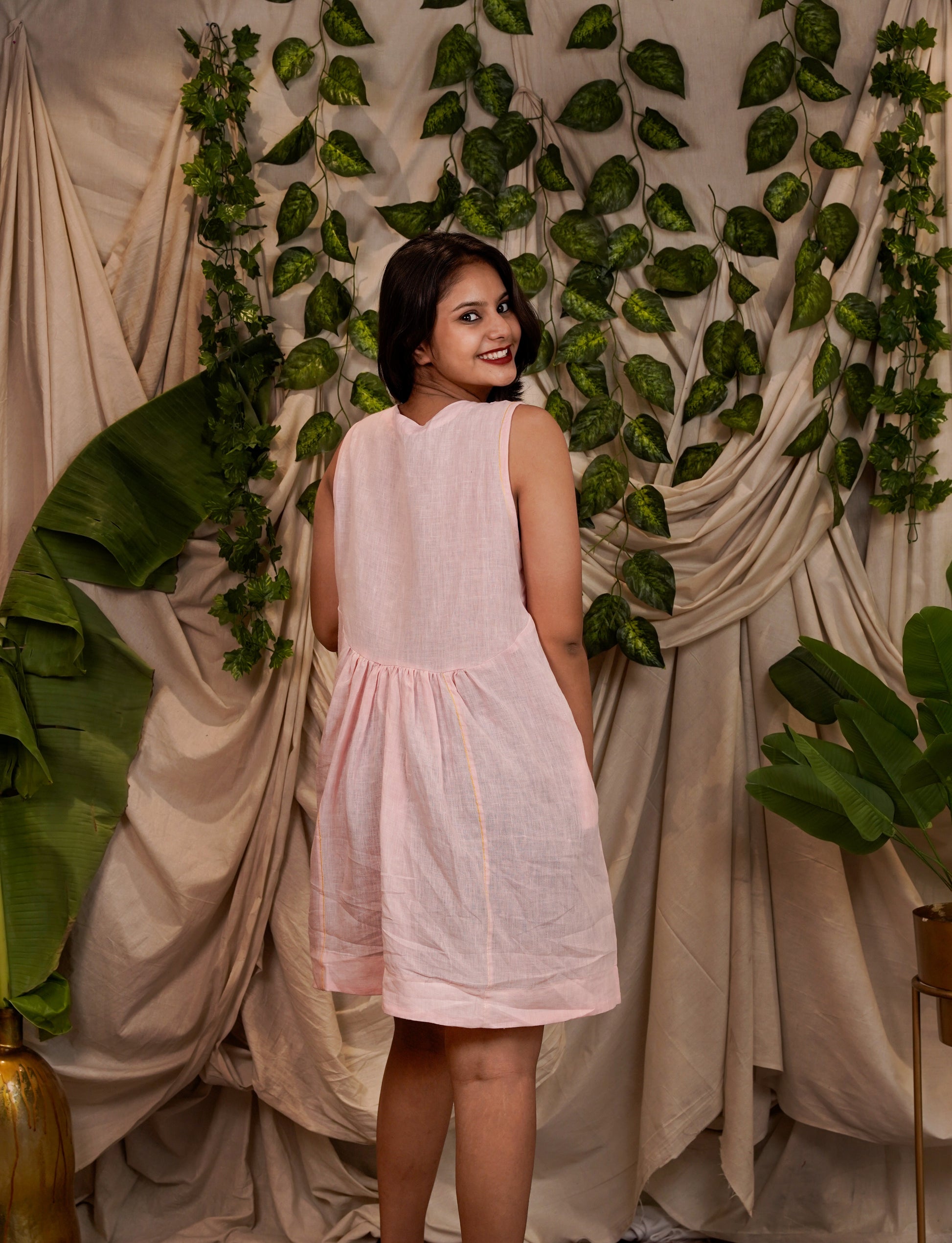 Blush blossom is the spring in coming personified ! Its a soft pink dress with intricate gathers and a touch of warmth with its embroidery details to make you feel like the new flower of a fresh spring morning. The dress features a button down neckline with shell buttons and every girl's dream to have in a dress- Pockets.