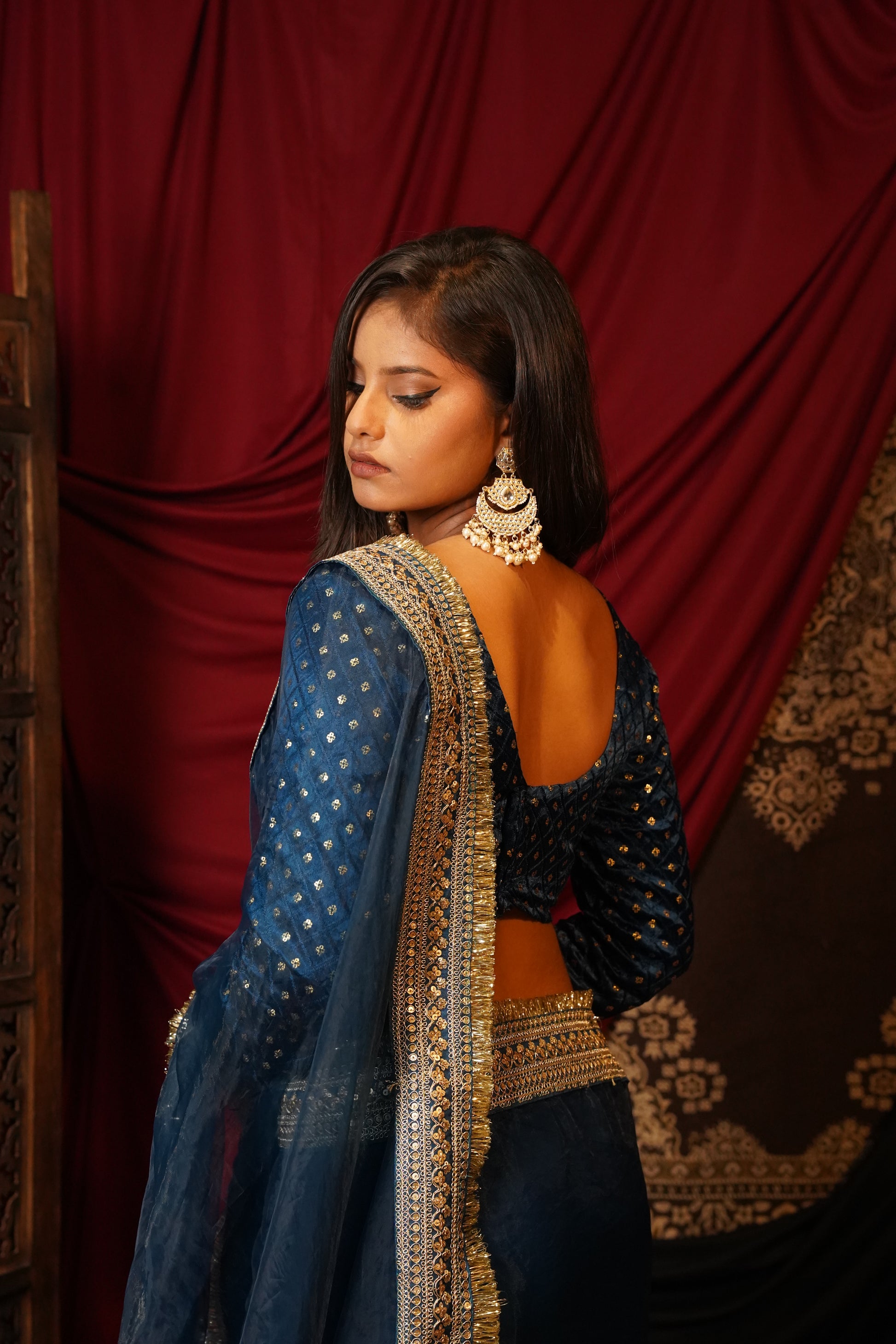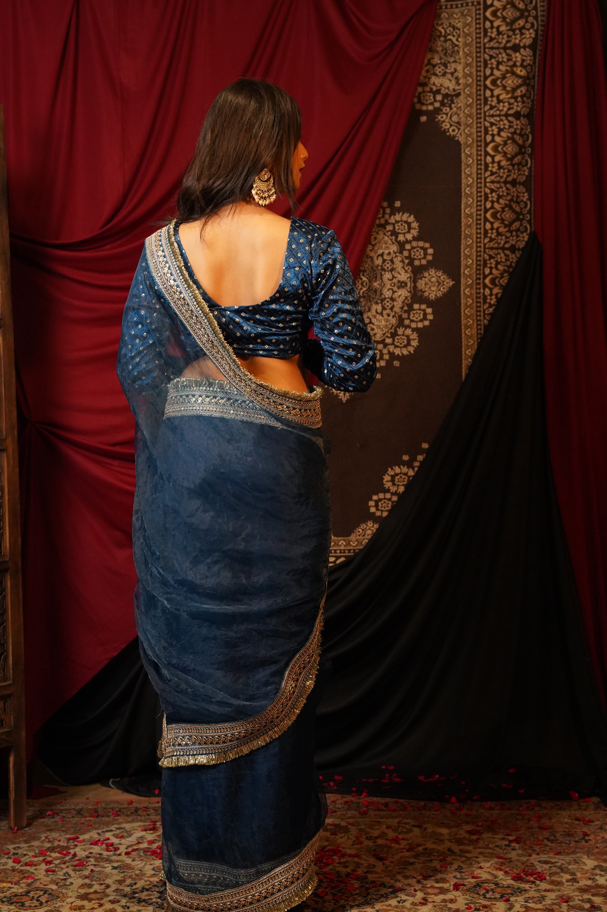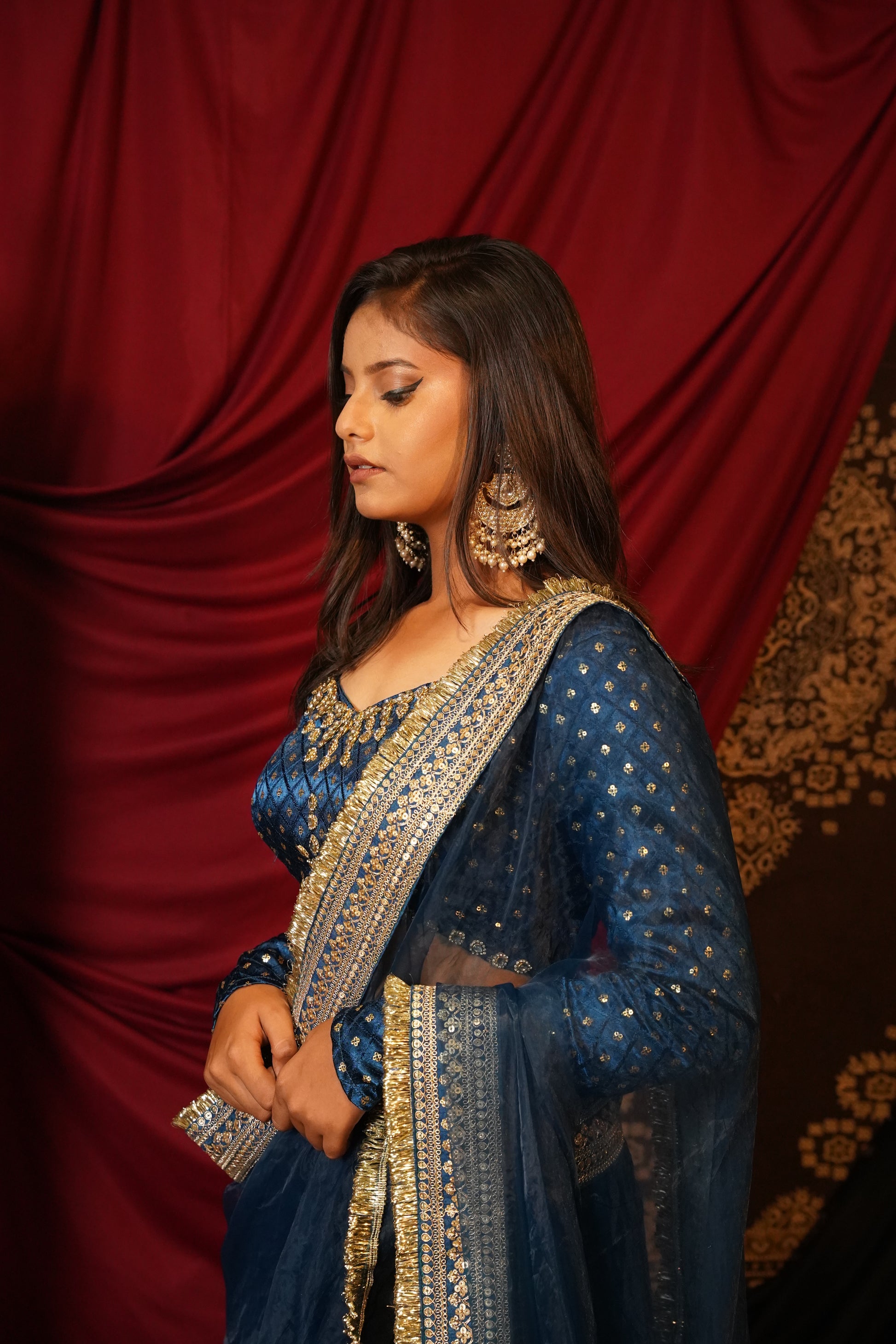 Step into a world of timeless elegance with our Chirata Twilight Blue Organza Saree. This stunning creation is crafted from luxurious twilight blue organza, offering a soft, ethereal drape. The blouse is adorned with intricate gold sequin work, exuding a refined charm that catches the light with every movement. The exquisite kiran lace detailing adds a regal touch, elevating the ensemble to new heights of grace and sophistication. Perfect for any festive occasion, Chirata is a beautiful blend of tradition and modern allure, making it the ultimate choice for those seeking elegance with a touch of sparkle.