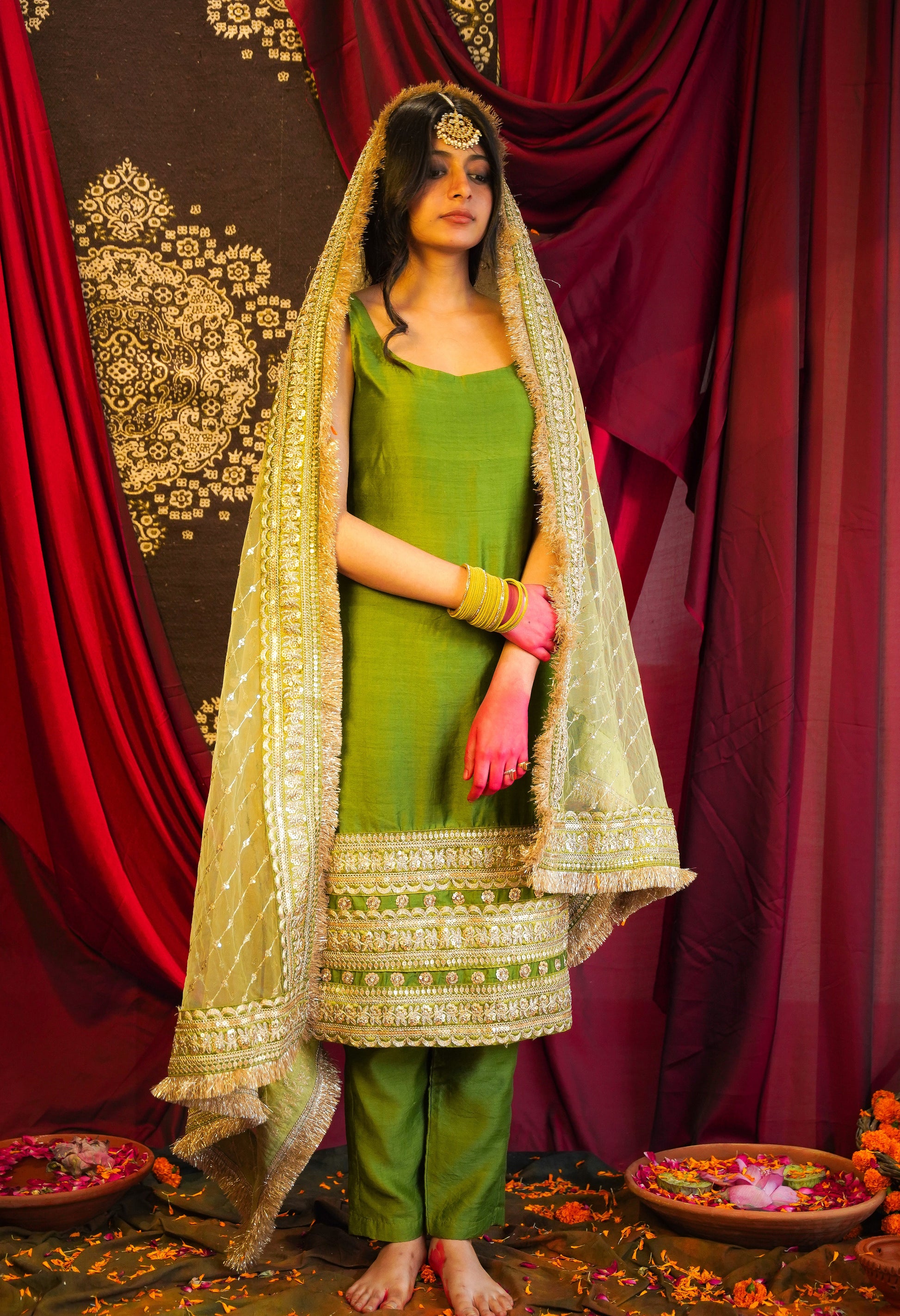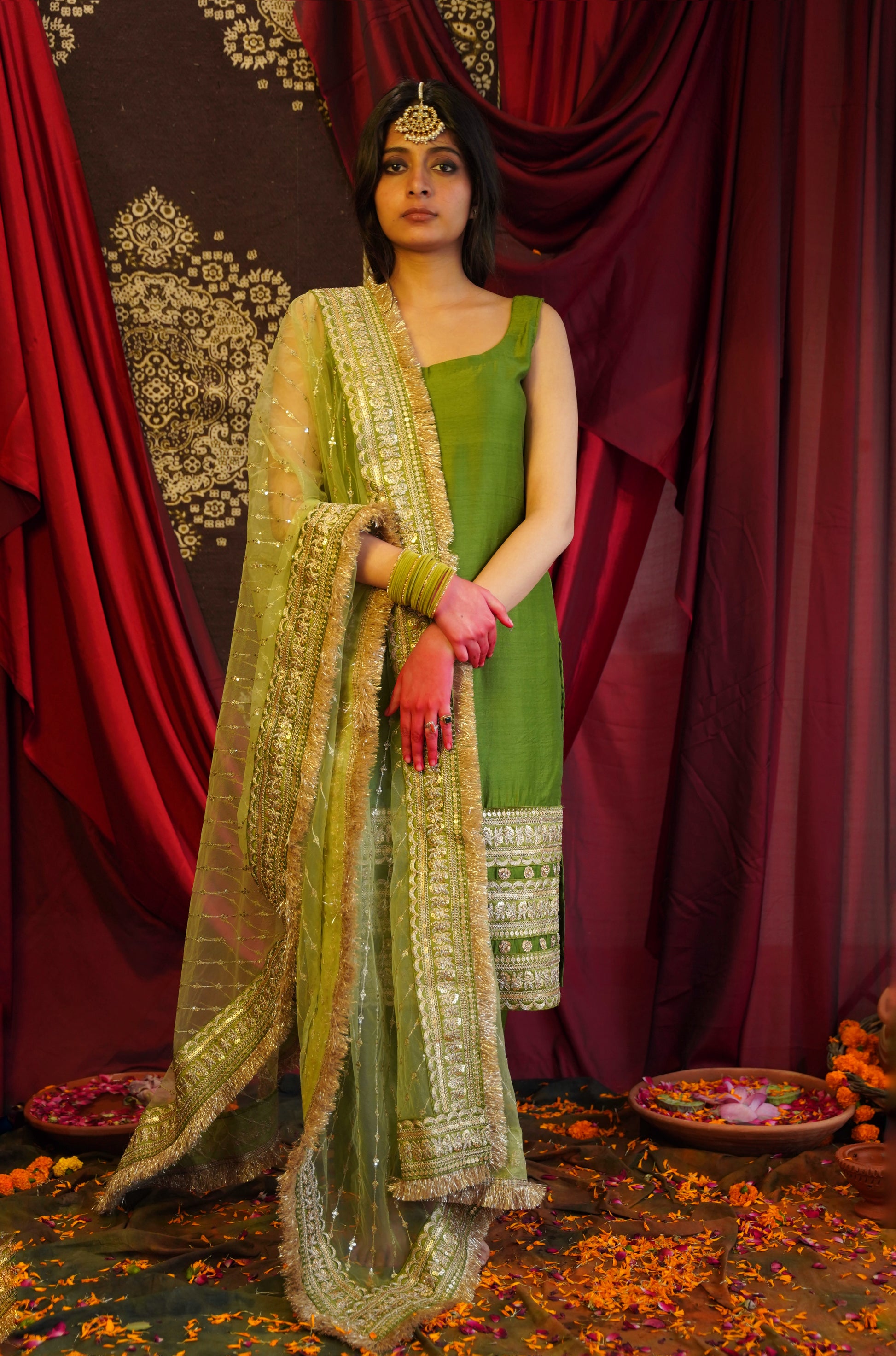 Step into the season of celebration with the Dilkashi (Attraction) Suit Set, an enchanting addition to our festive collection. This elegant set, rendered in a serene light green hue, features a beautifully designed kurta, tailored trousers, and a flowing dupatta. The kurta boasts intricate detailing, reflecting the theme of love and attraction with its delicate embroidery. The trousers provide a comfortable yet chic fit, while the dupatta adds an ethereal touch, making this ensemble perfect for festive occasions. Embrace the allure of Dilkashi and let its graceful charm enhance your festive celebrations.