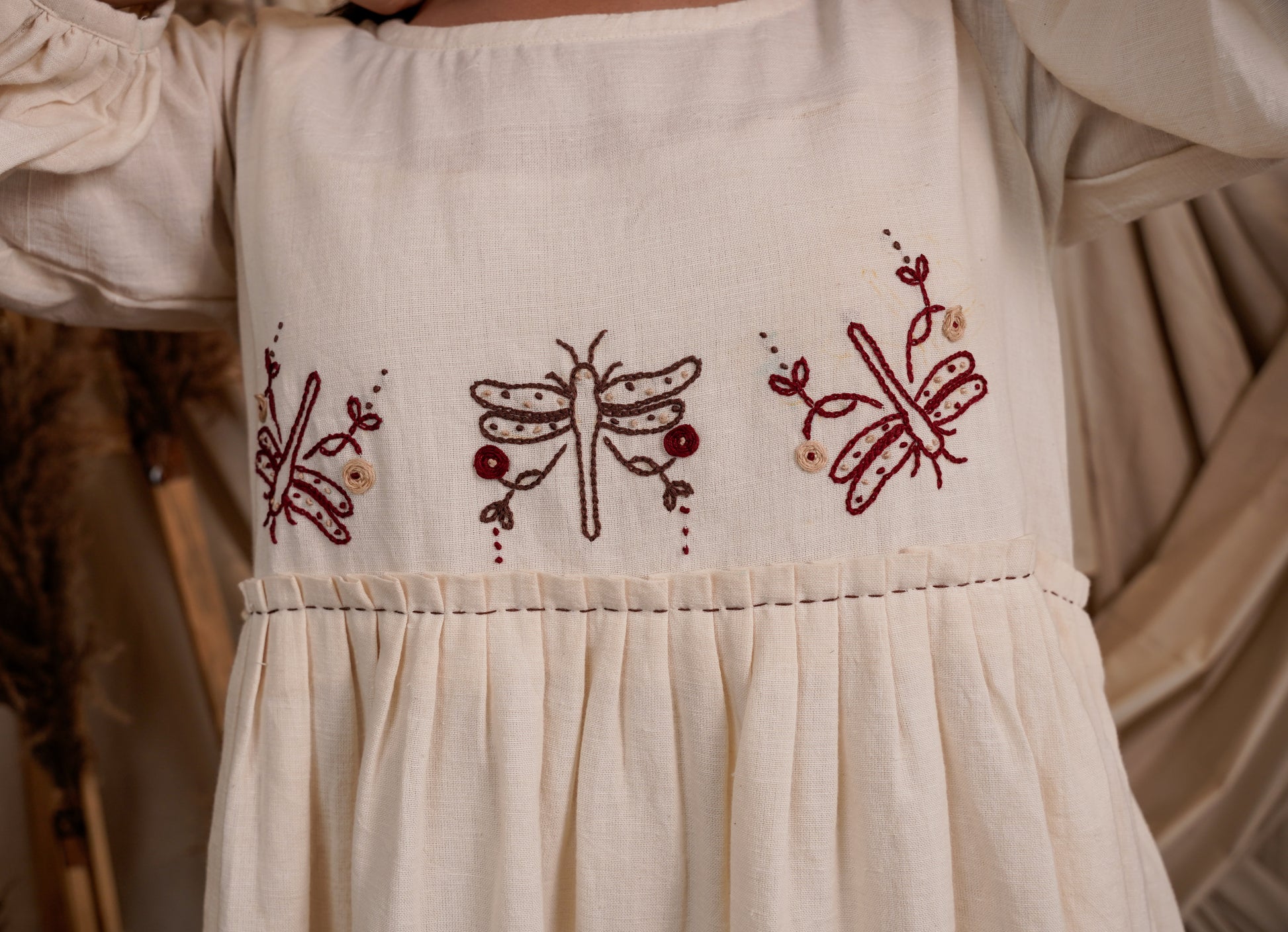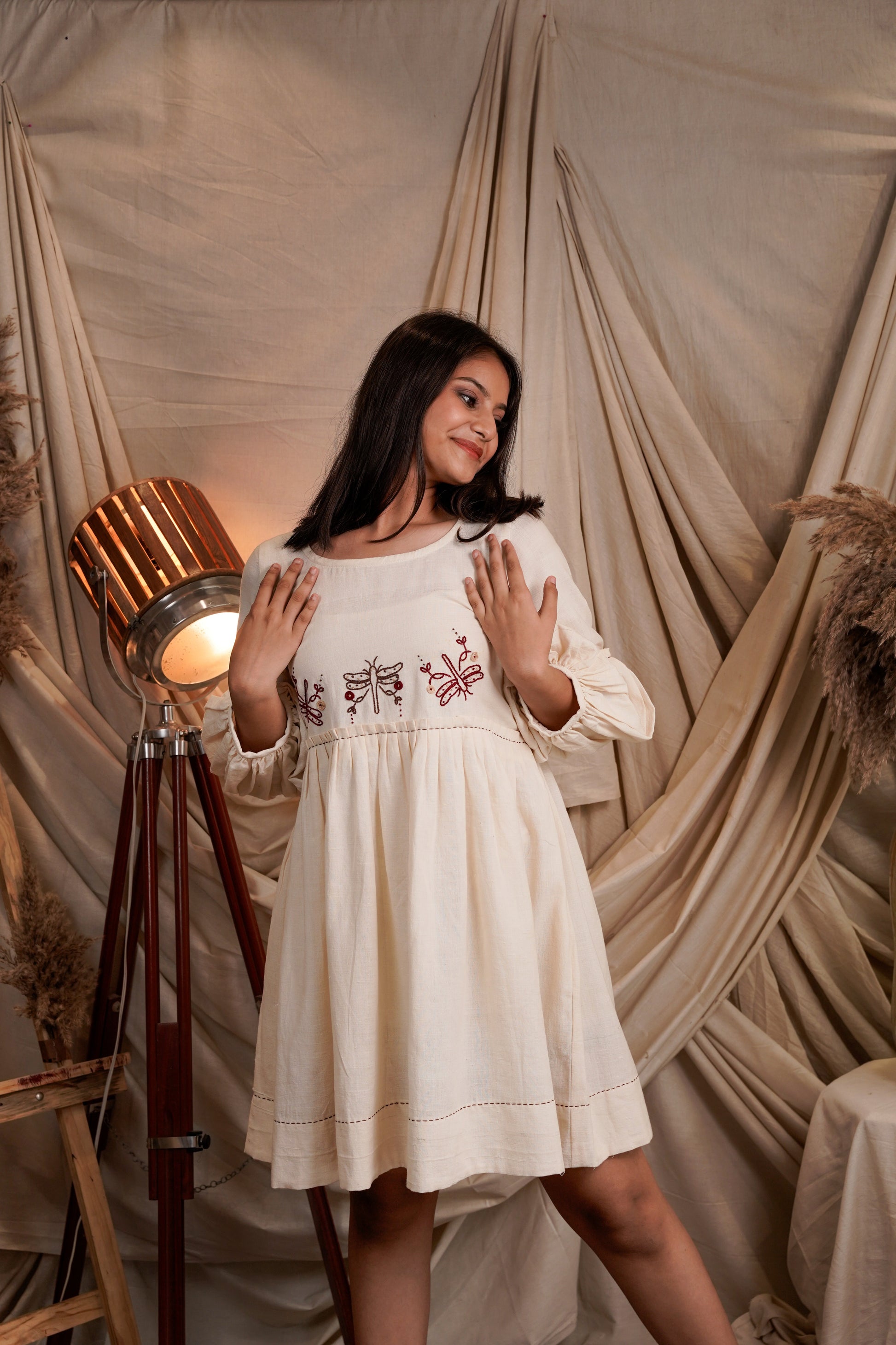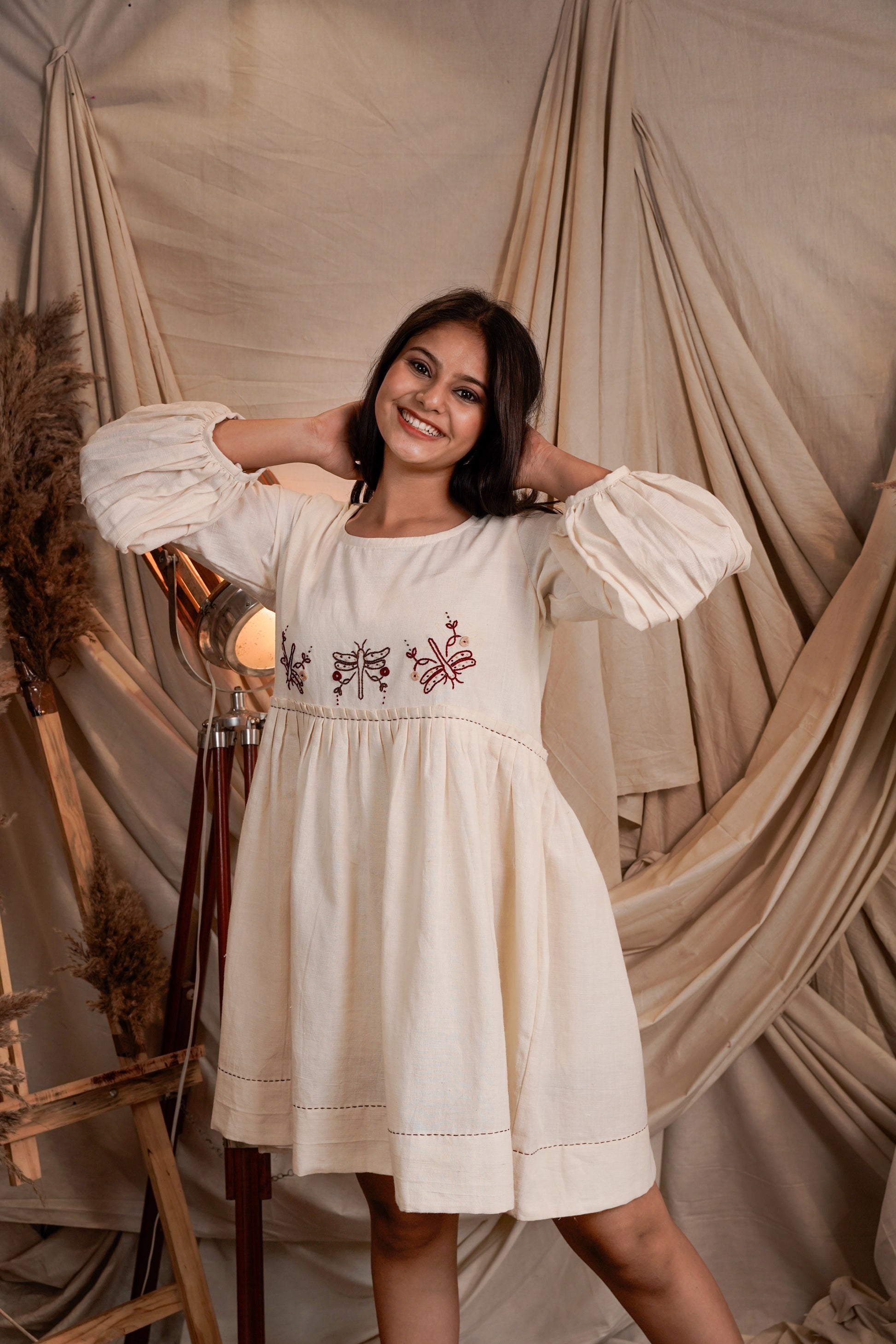 Dragon fly is a tunic dress with intricate pleating and hand embroidery inspired by the one of the most overseen creatures of nature- the dragon fly. The hand embroidery resonates the intricate and delecate wings of the dragon fly and the easy breezy silhouette made in soft hand woven khadi makes the ensemble a delight to the skin.