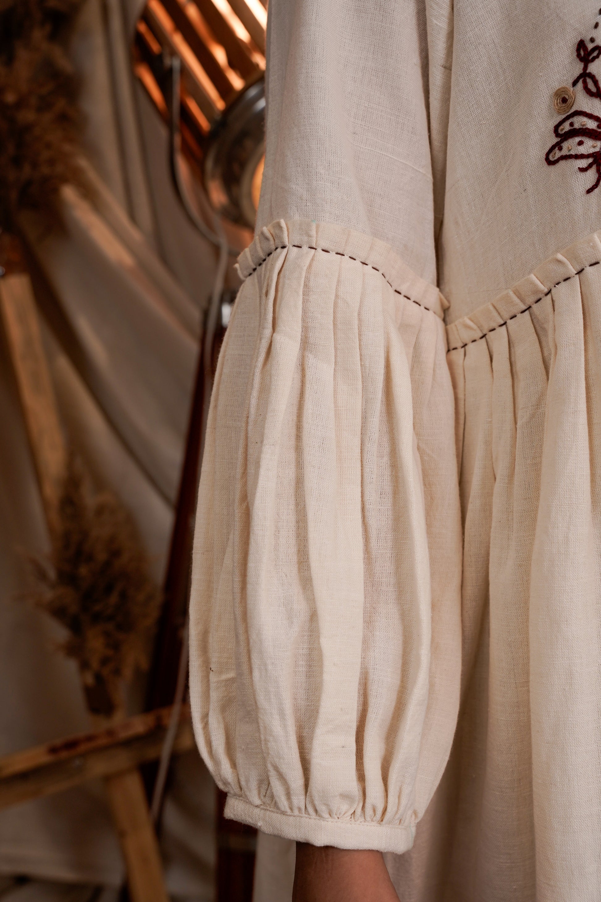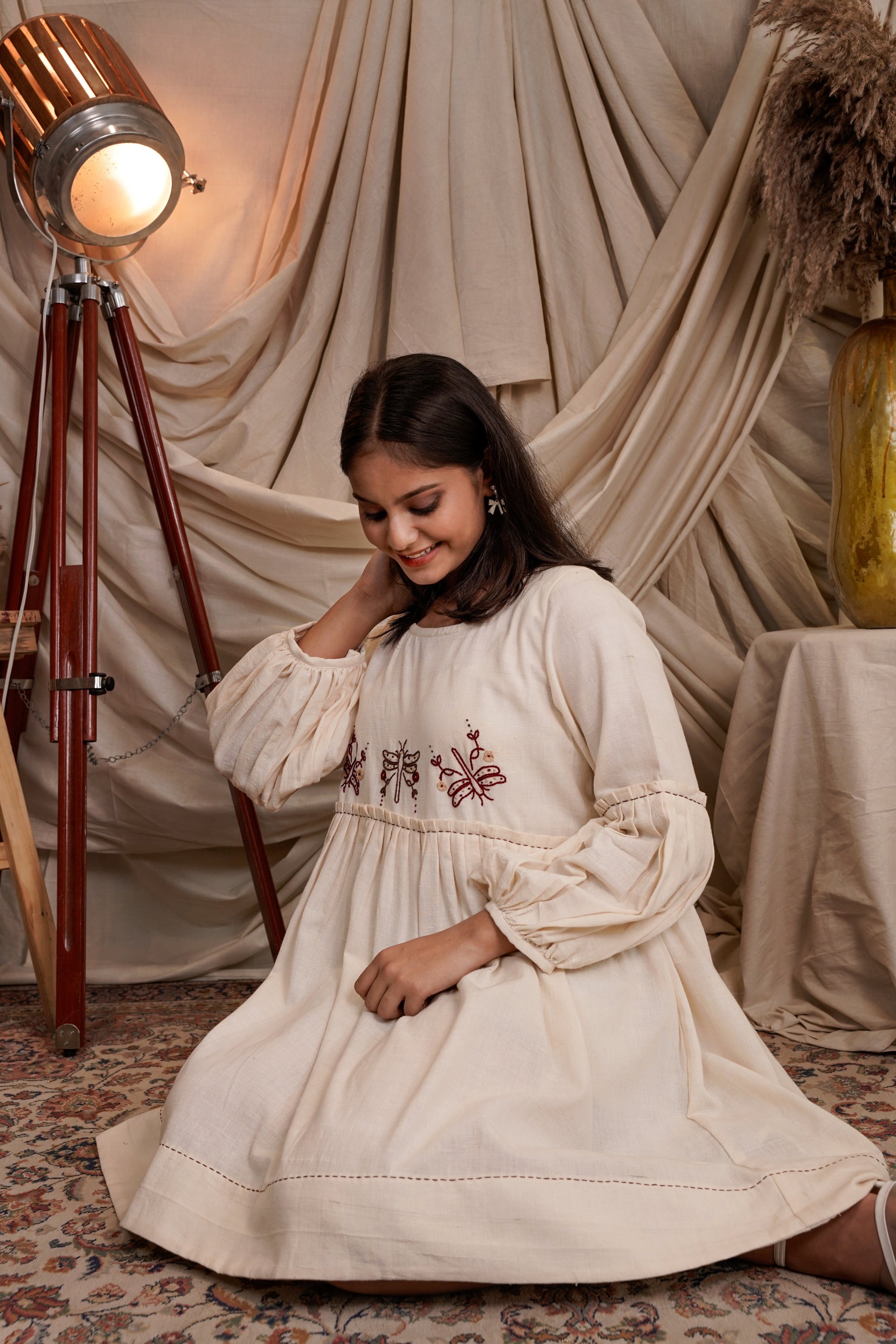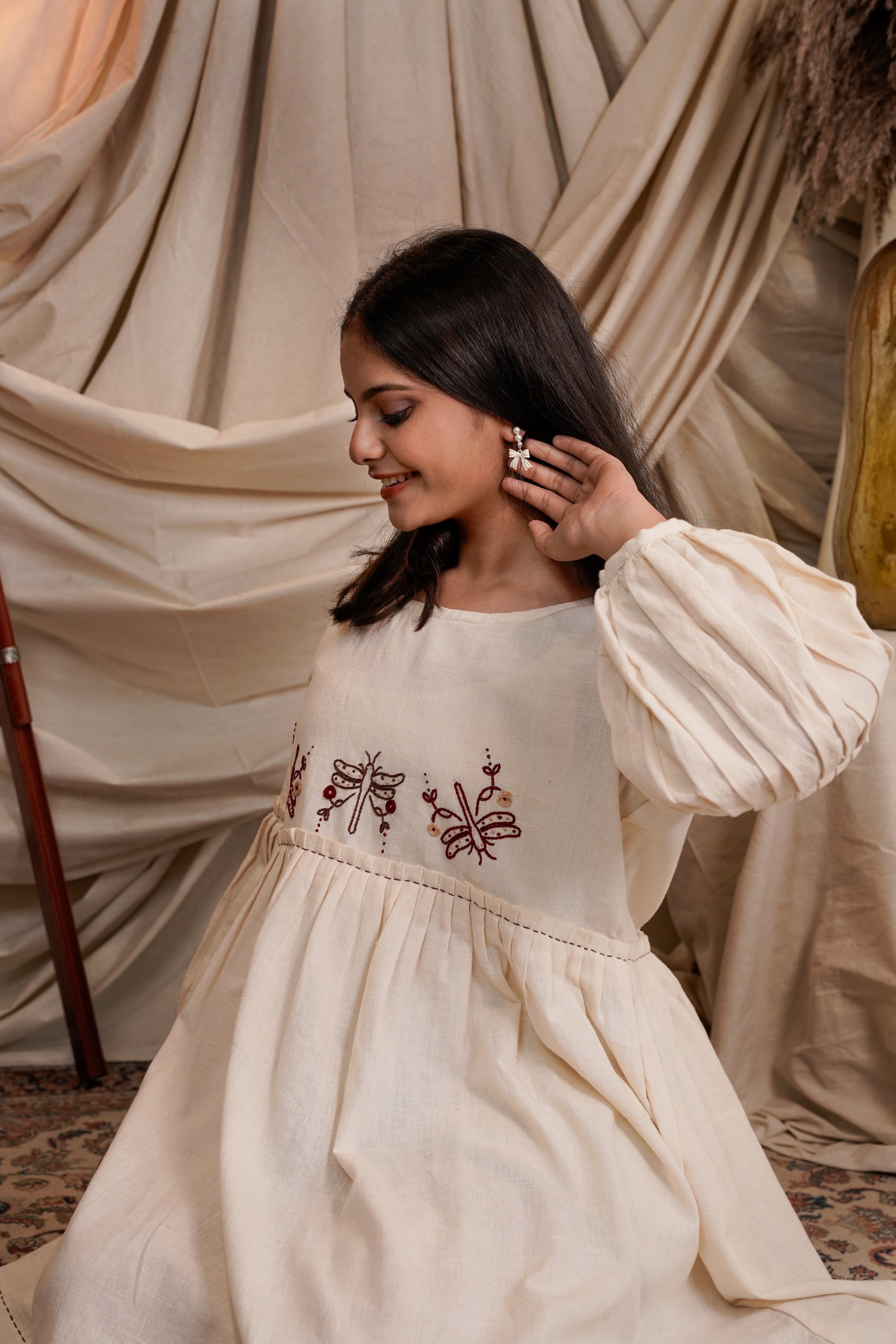 Dragon fly is a tunic dress with intricate pleating and hand embroidery inspired by the one of the most overseen creatures of nature- the dragon fly. The hand embroidery resonates the intricate and delecate wings of the dragon fly and the easy breezy silhouette made in soft hand woven khadi makes the ensemble a delight to the skin.