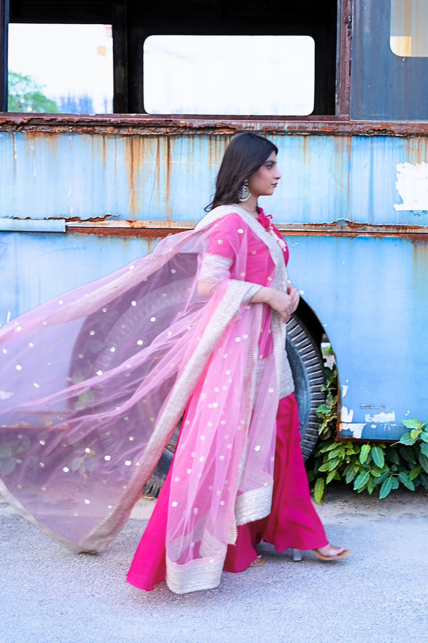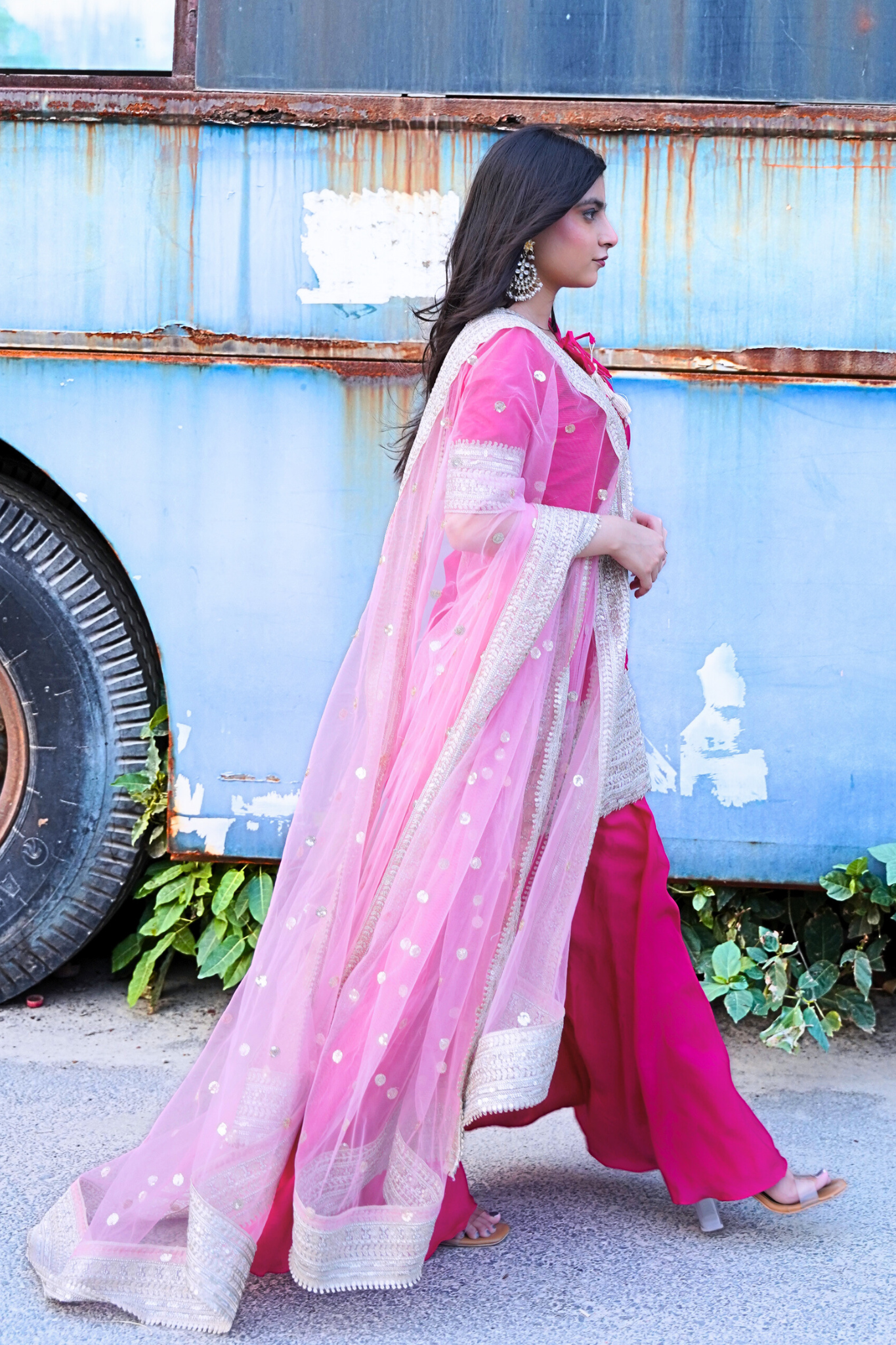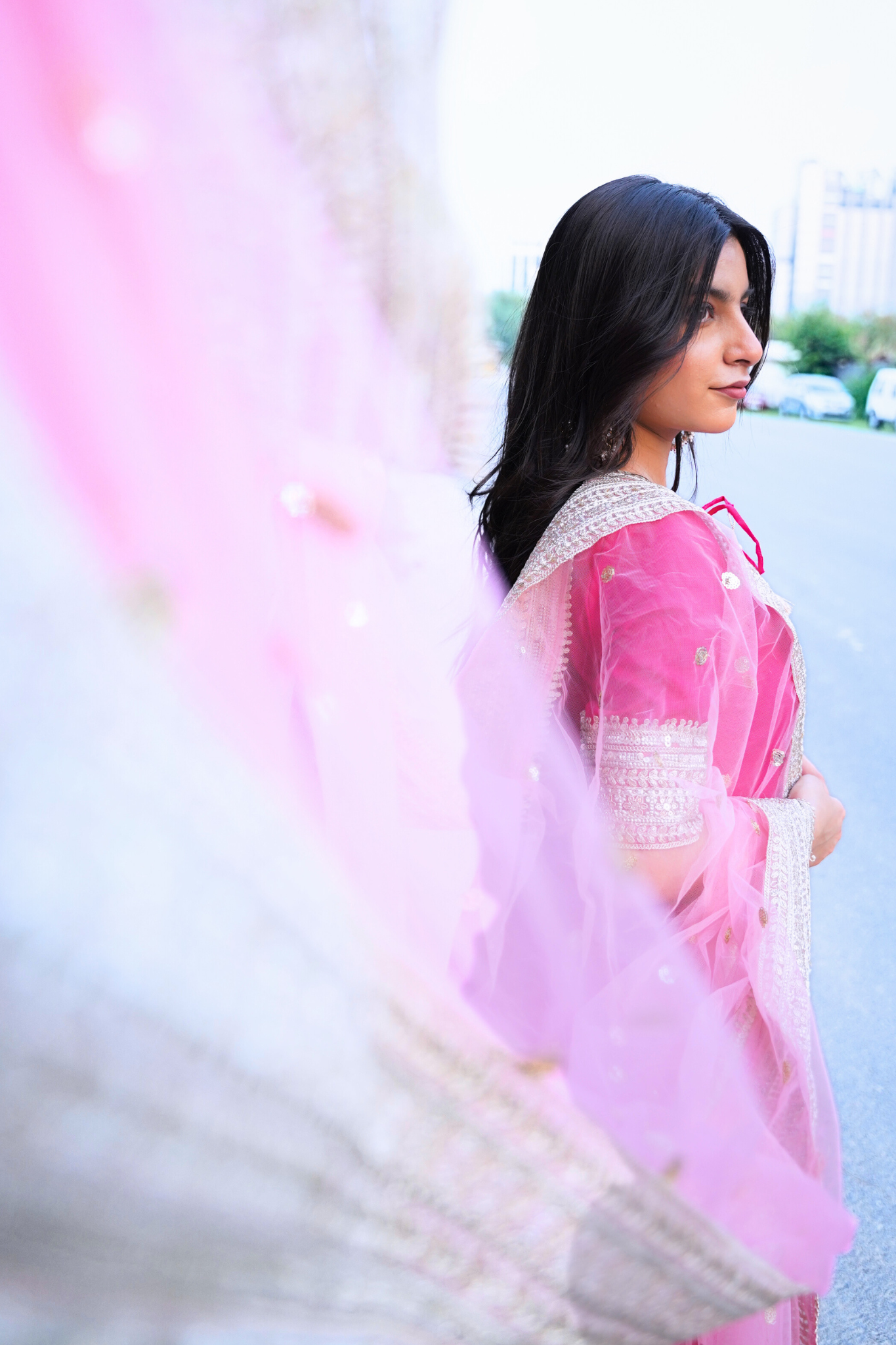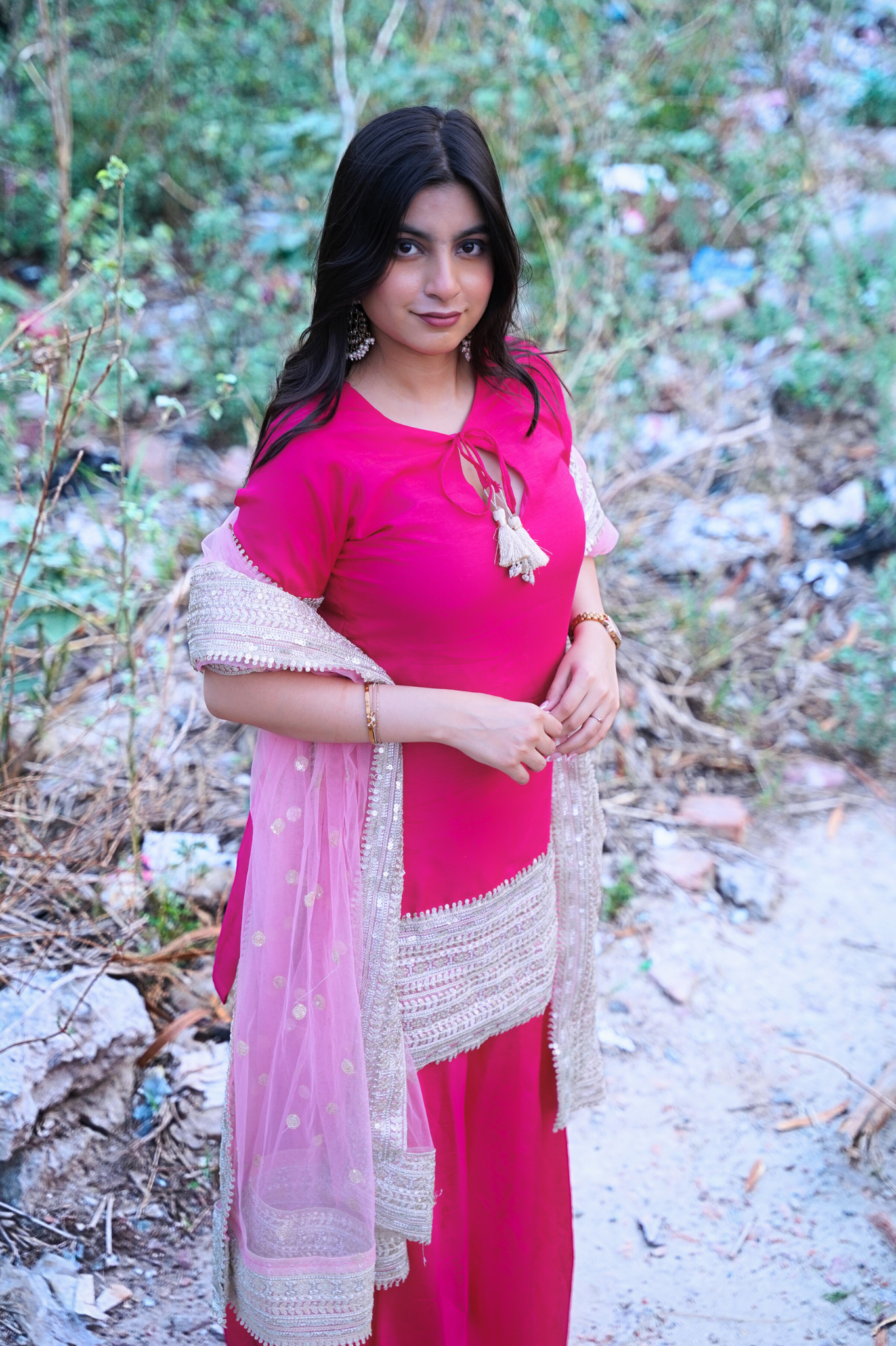 Gulaal is a stunning pink sharara set that radiates timeless elegance. The outfit is adorned with intricate zari lace, adding a rich and traditional touch to the overall look. Paired with a delicate net dupatta, it creates a graceful silhouette that’s perfect for festive celebrations, weddings, and special occasions. Gulaal beautifully blends comfort, charm, and sophistication — a must-have for every festive wardrobe.