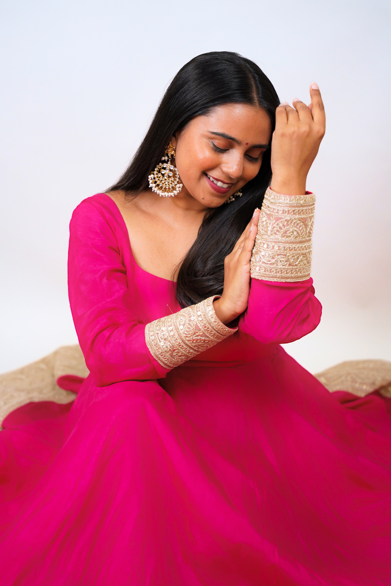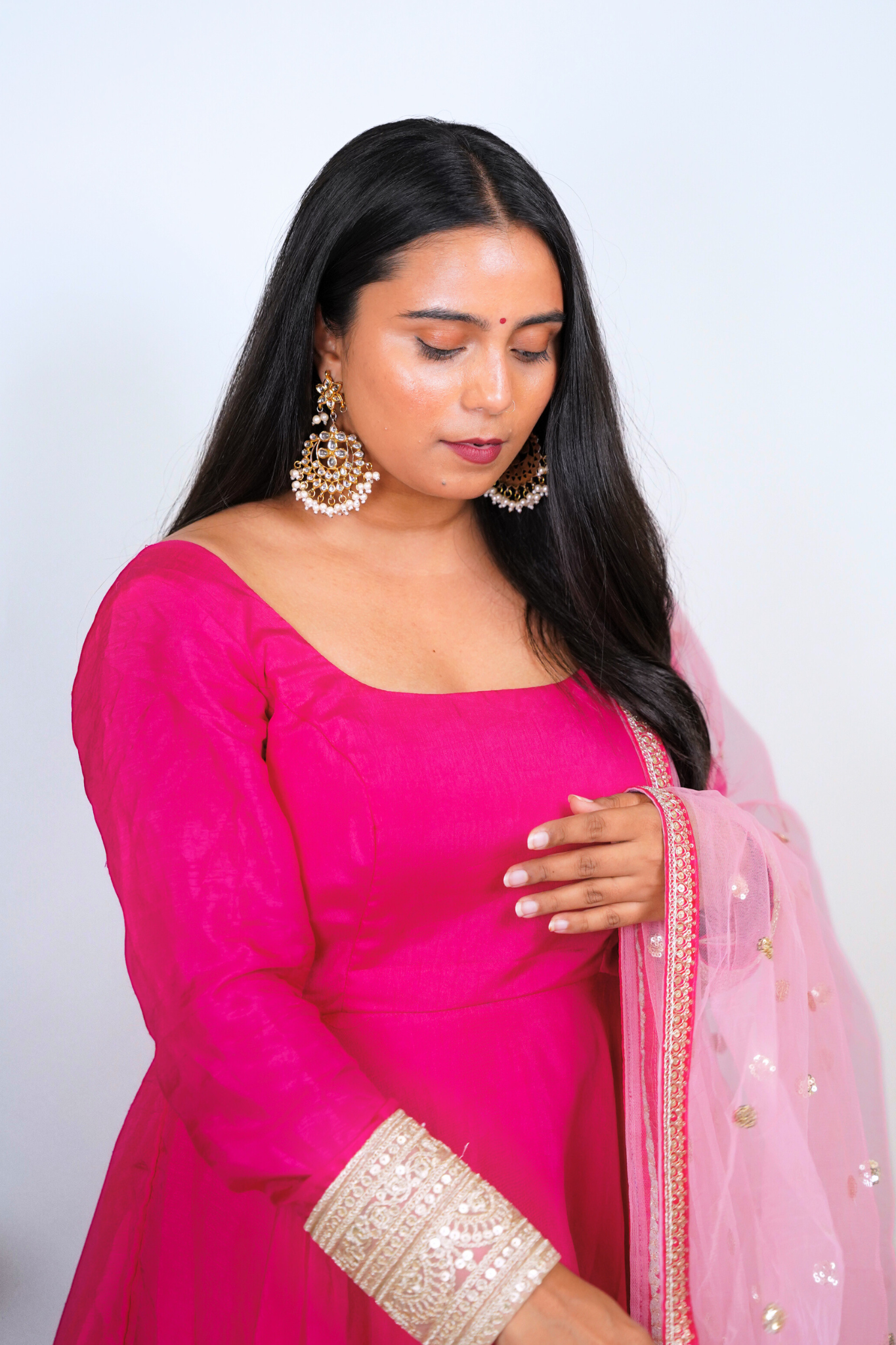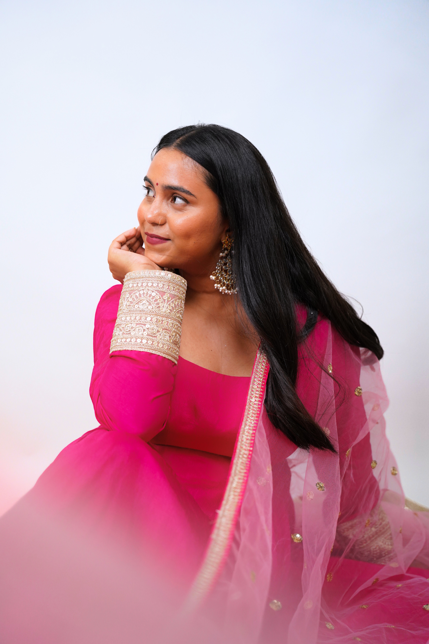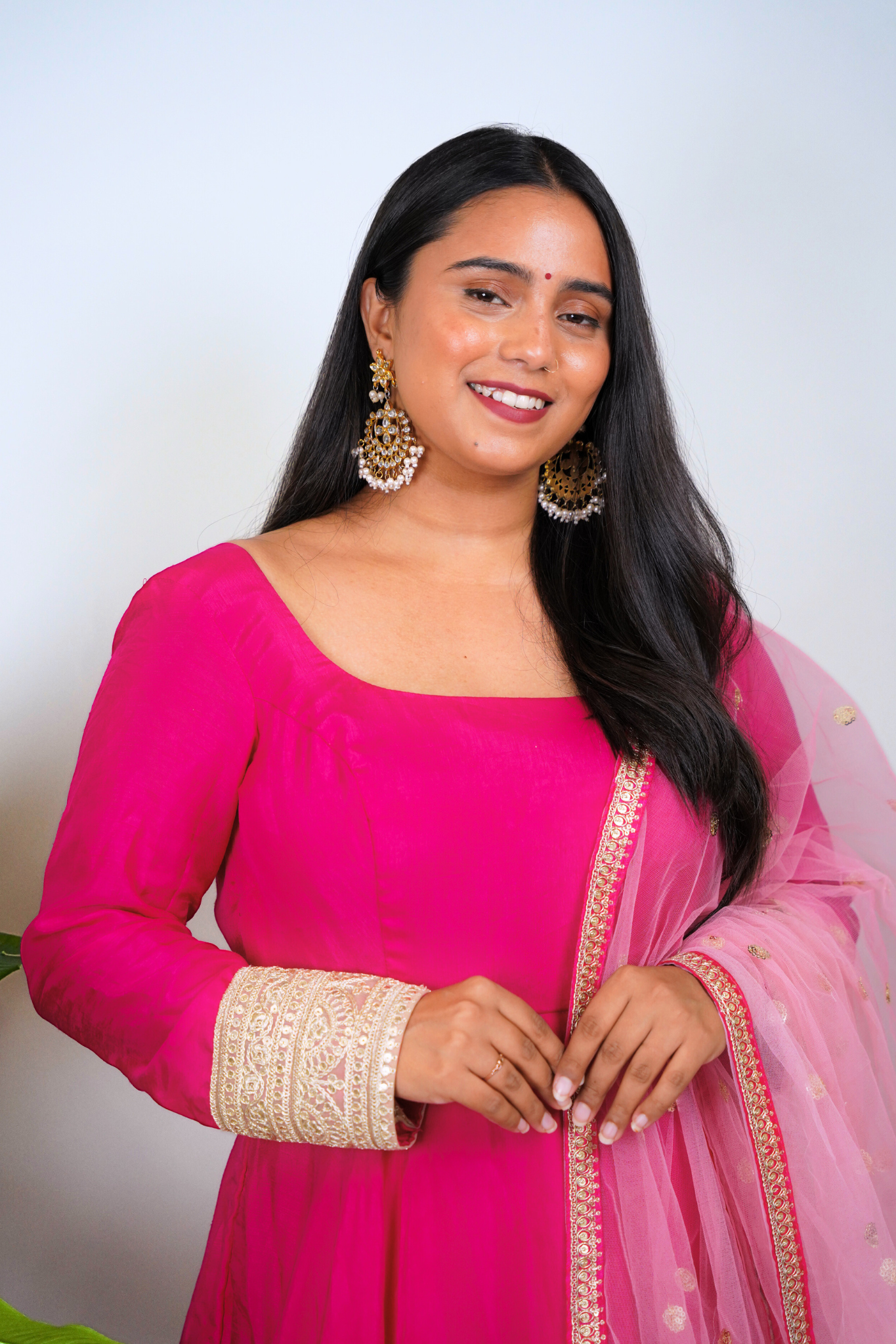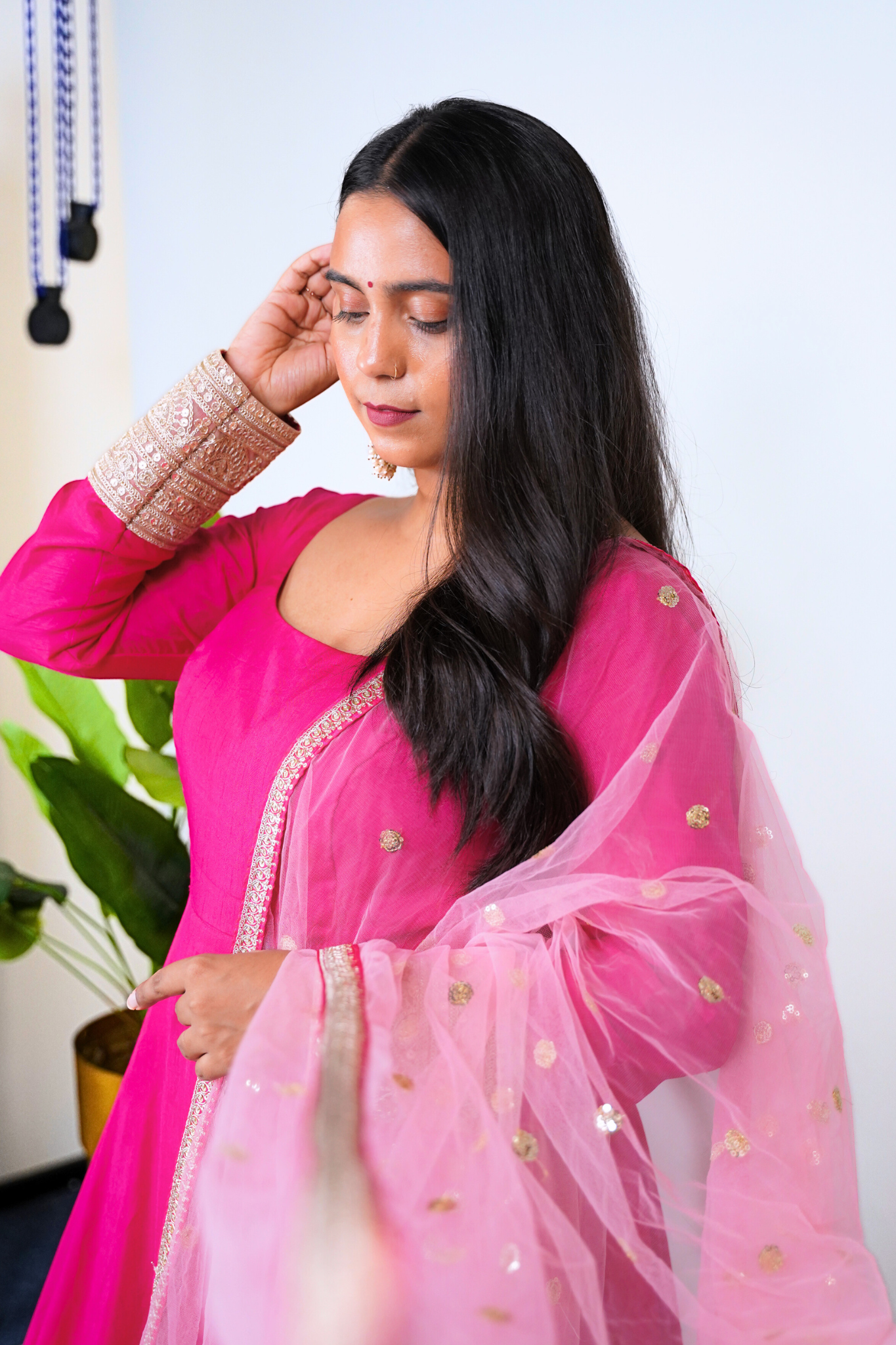 Embrace sheer elegance with our Gulabi Noor Pink Anarkali, a symbol of grace and timeless allure. This exquisite ensemble features a flowy silhouette adorned with a luxurious zari-thread border, radiating understated opulence. The soft net dupatta adds an ethereal charm, perfectly complementing the refined look of the Anarkali. Designed for special occasions, Gulabi Noor beautifully blends traditional craftsmanship with modern sophistication, making it a must-have statement piece for your festive wardrobe.