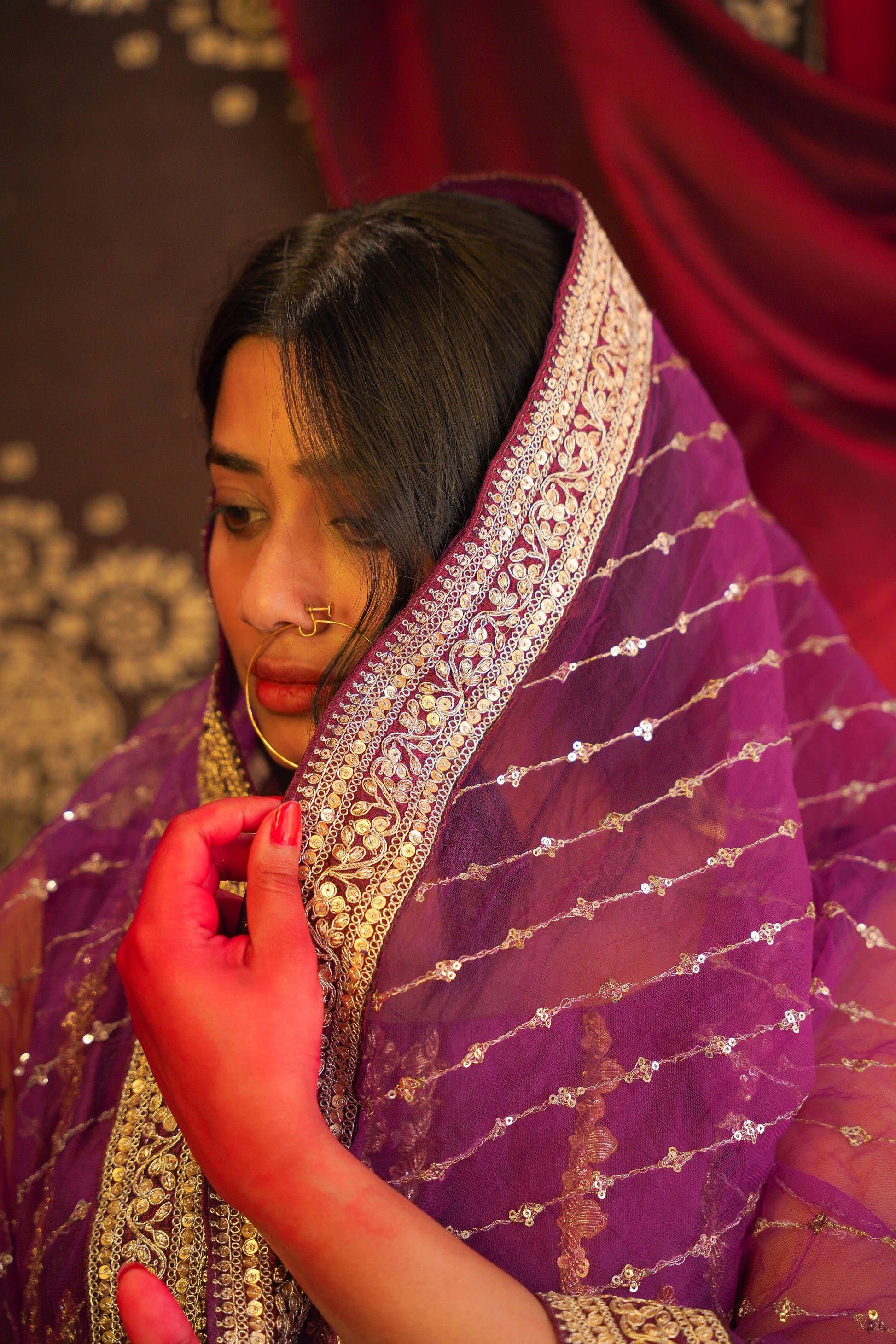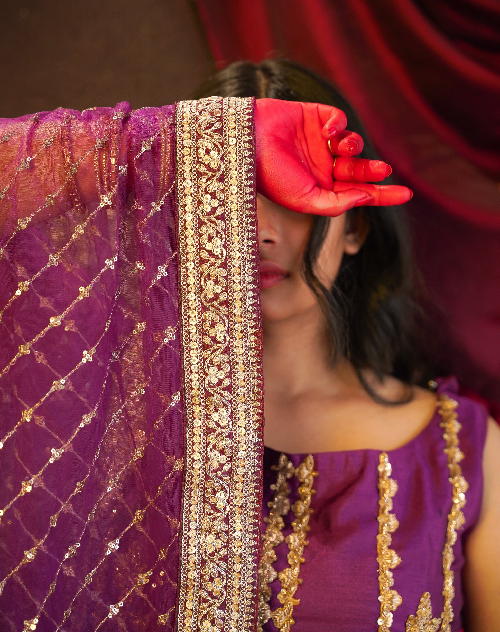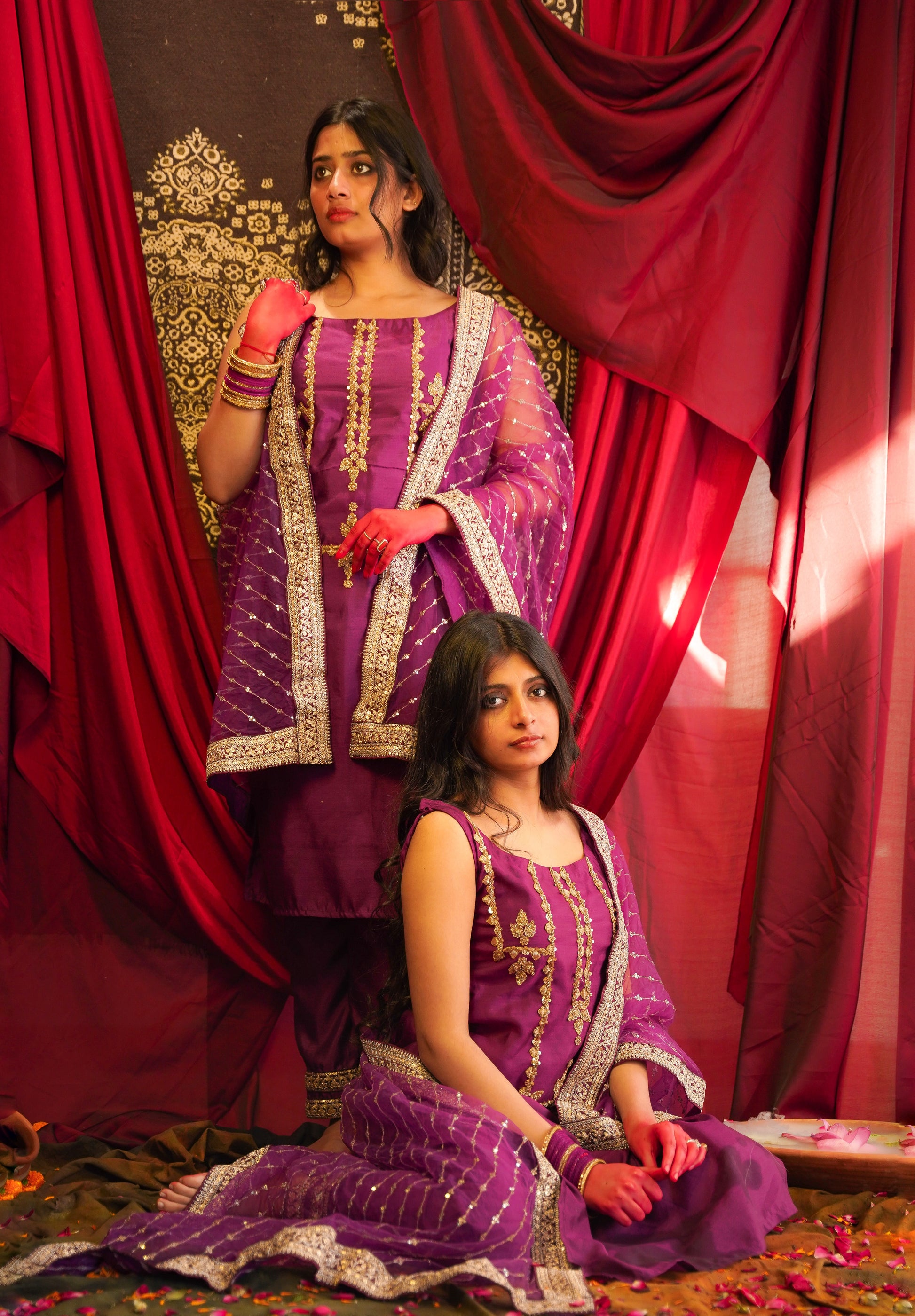 Style the Israar (Mystery) Suit Set with golden jewelry, such as a choker necklace and drop earrings, to enhance its regal purple hue. Opt for metallic-toned heels or juttis to complement the ensemble.