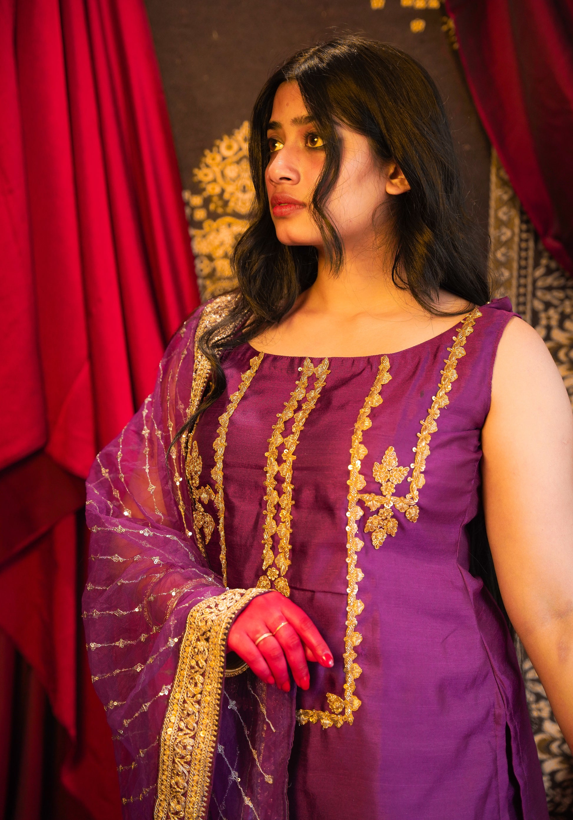 Unveil the allure of love with the Israar (Mystery) Suit Set, a captivating ensemble from our festive collection. Drenched in a rich purple hue, this set features a gracefully designed kurta, perfectly tailored trousers, and a matching dupatta. The intricate detailing on the kurta embodies the enigmatic charm of love, while the deep, regal color adds a touch of mystique. Let this enchanting outfit be your go-to for creating unforgettable memories.