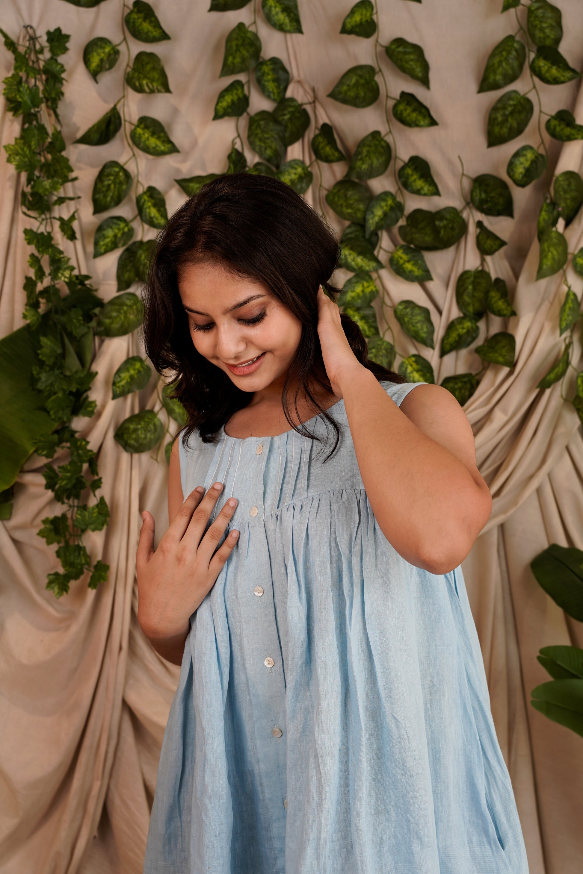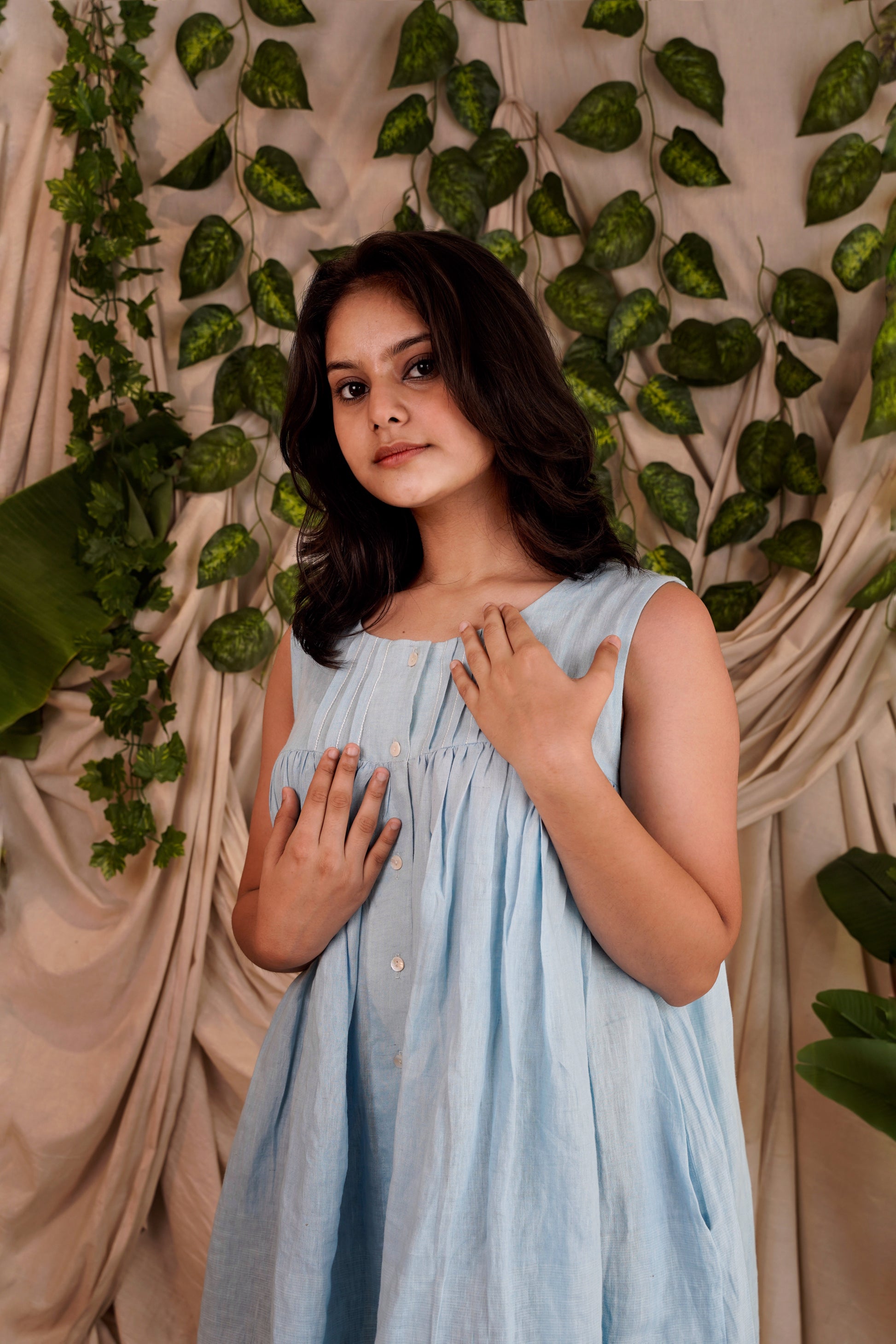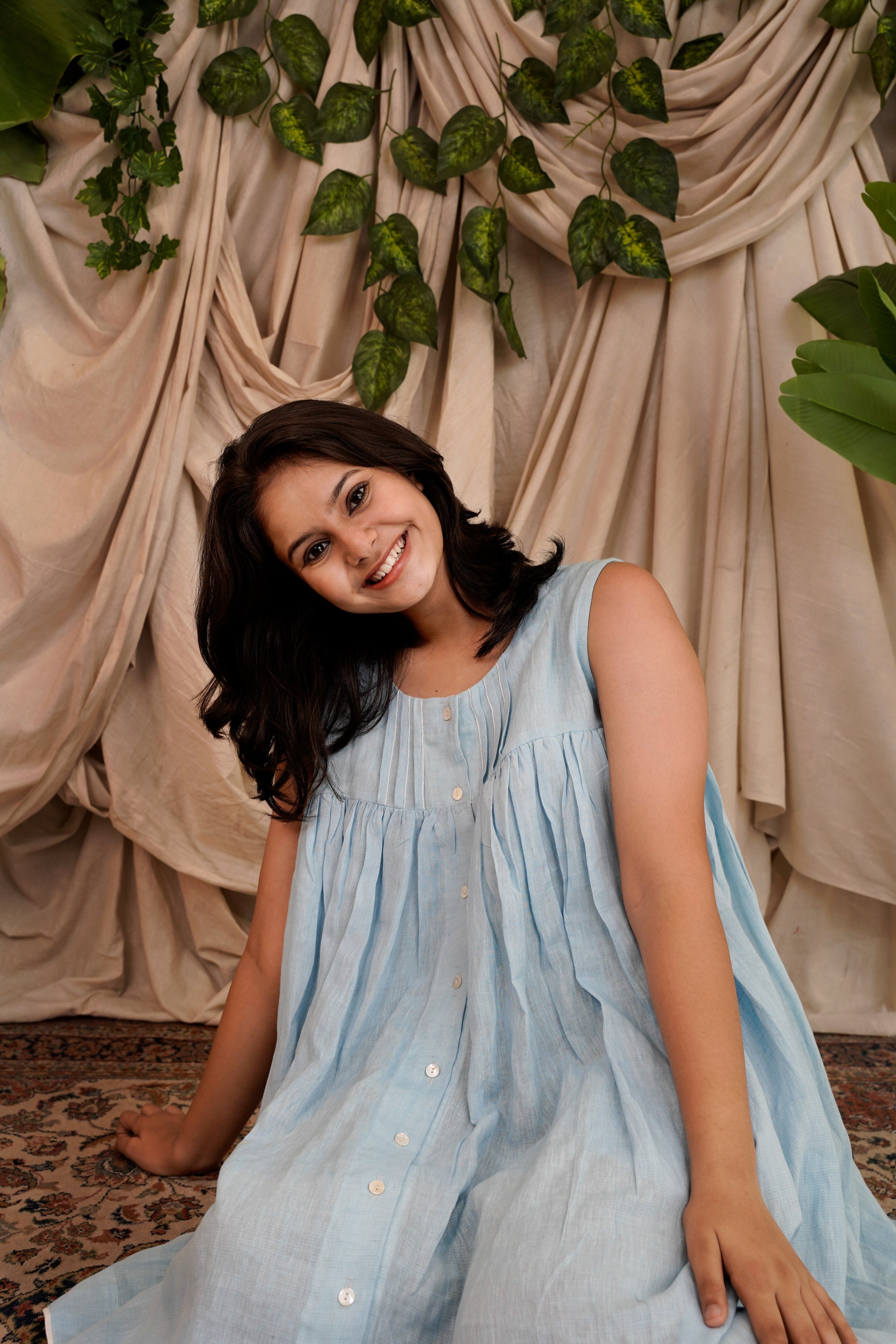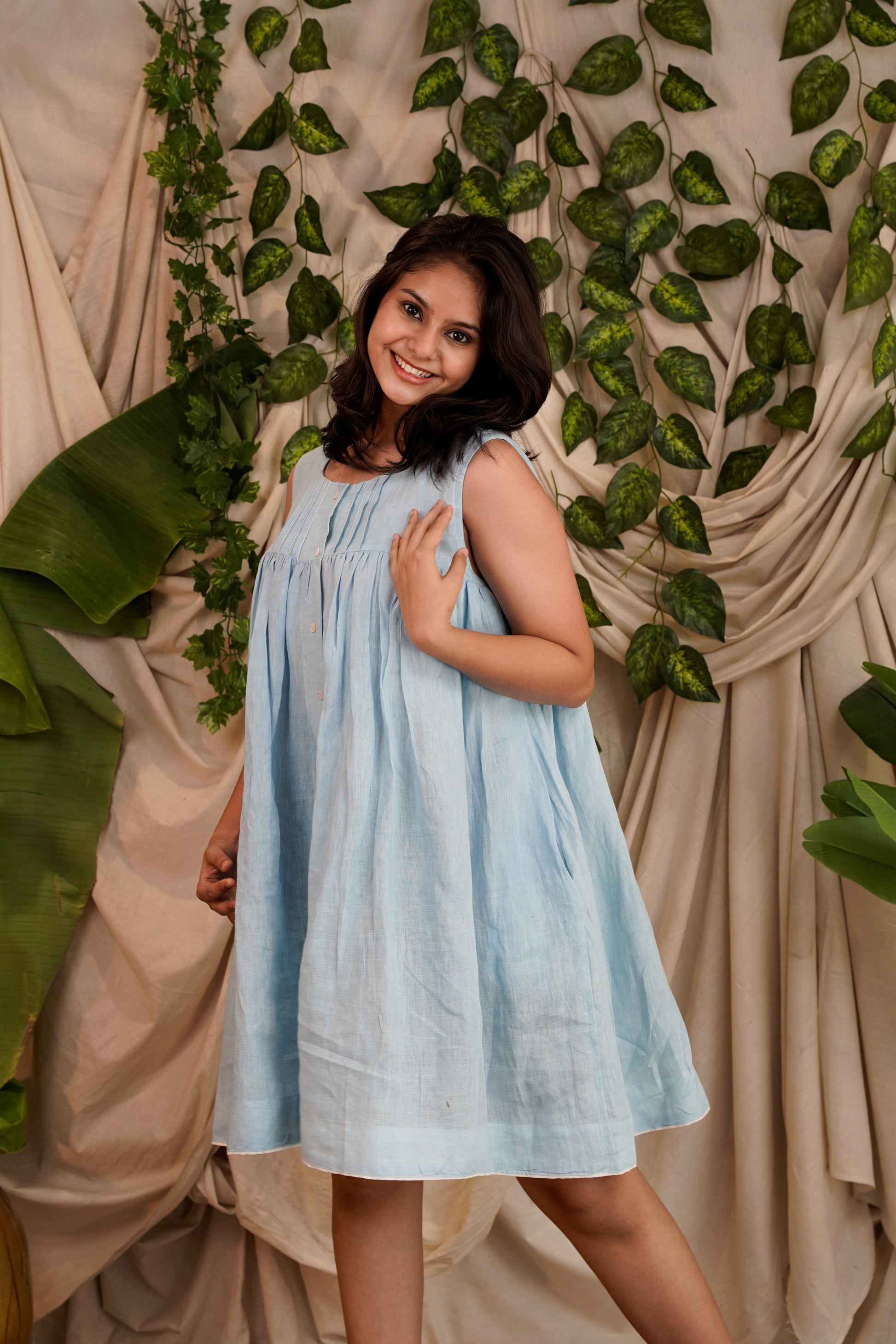 Embrace the refreshing charm of the Monsoon. This airy, sky-blue linen dress features delicate pin tucks and soft gathers, creating a flowy silhouette that moves gracefully with you. its light and breathable fabric ensures you stay comfortable while looking effortlessly stylish. Monsoon is an easy to carry tunic style dress that can also be paired along with pants or shorts because of its minimal yet versatile silhouette.