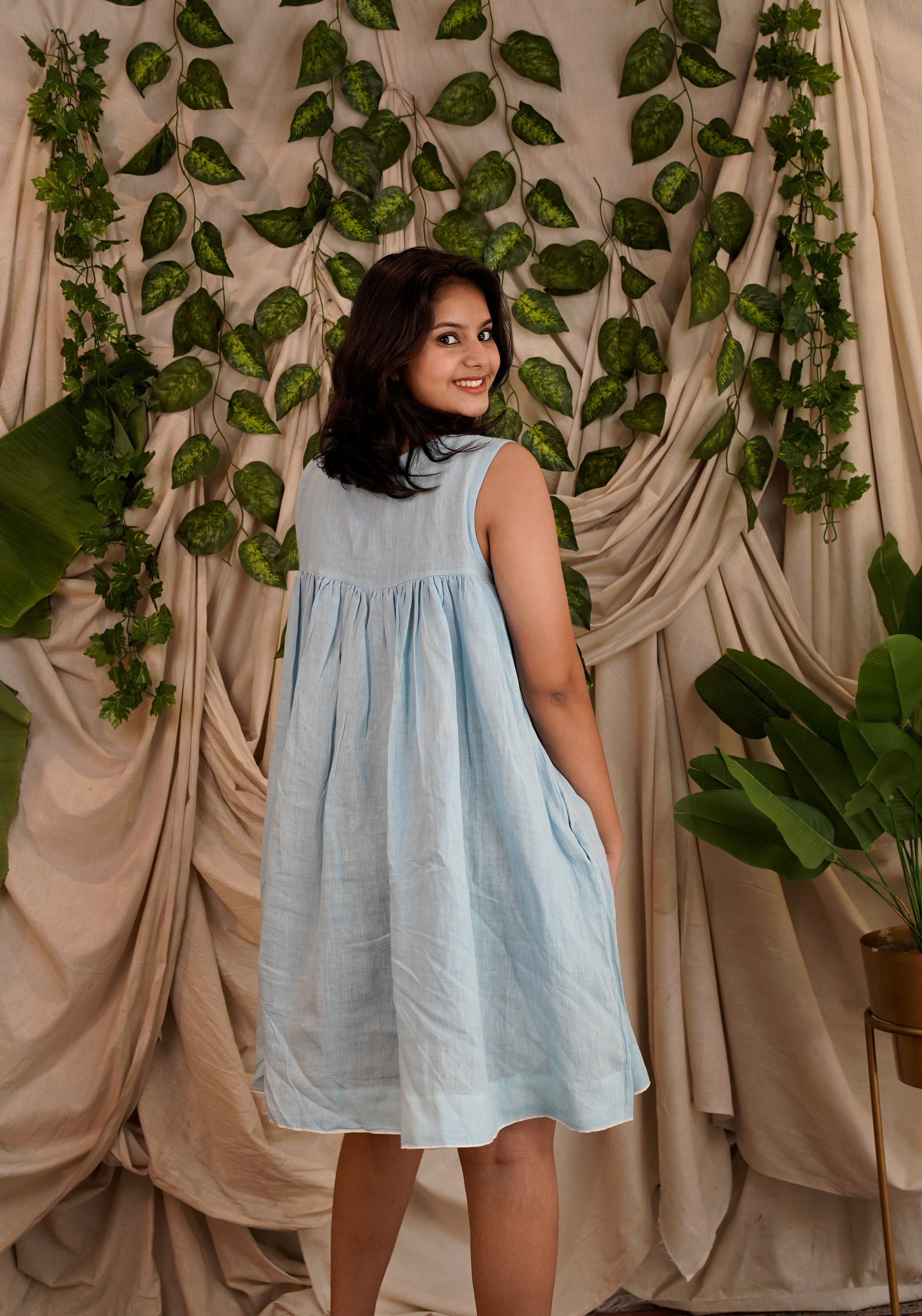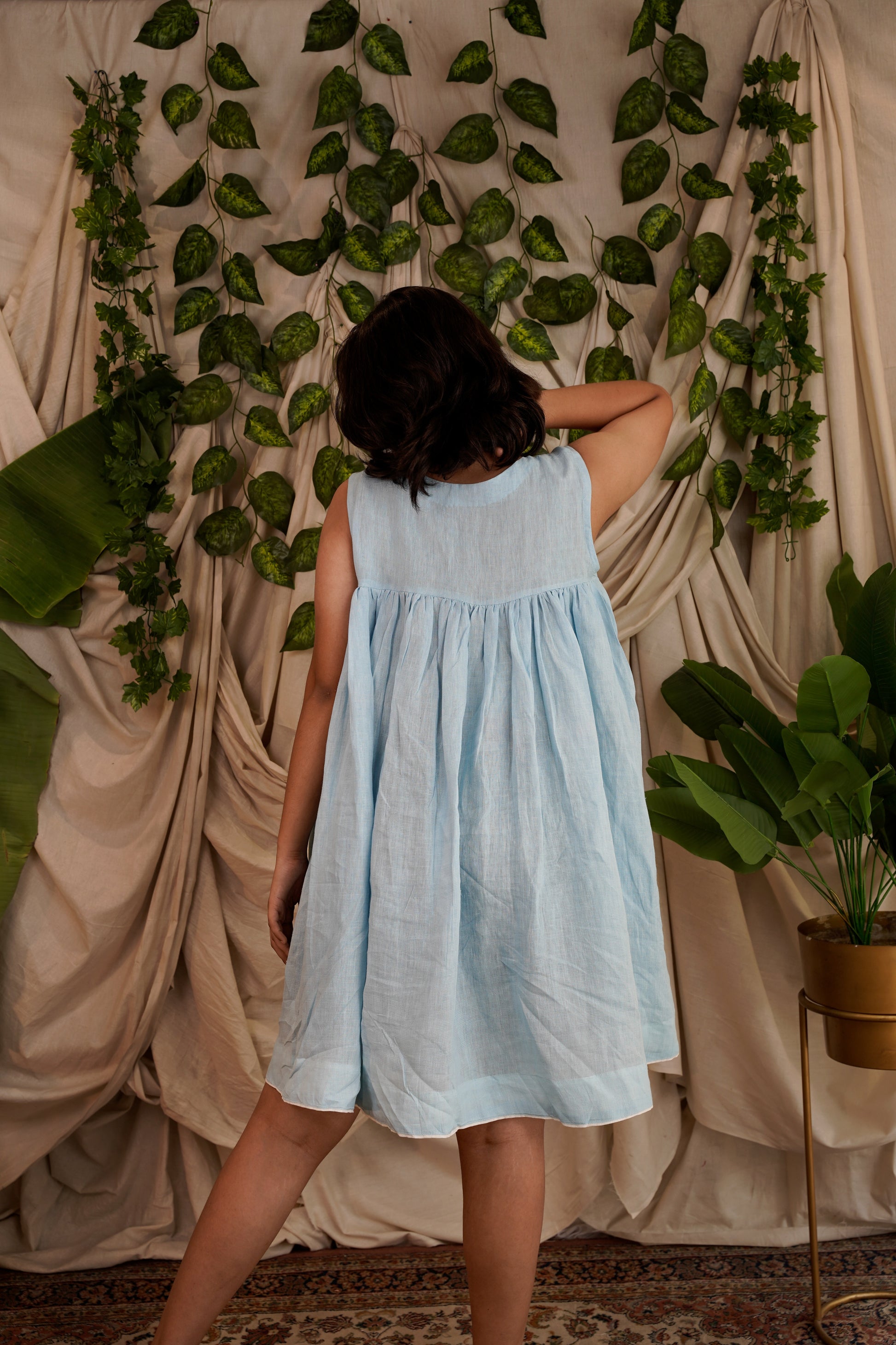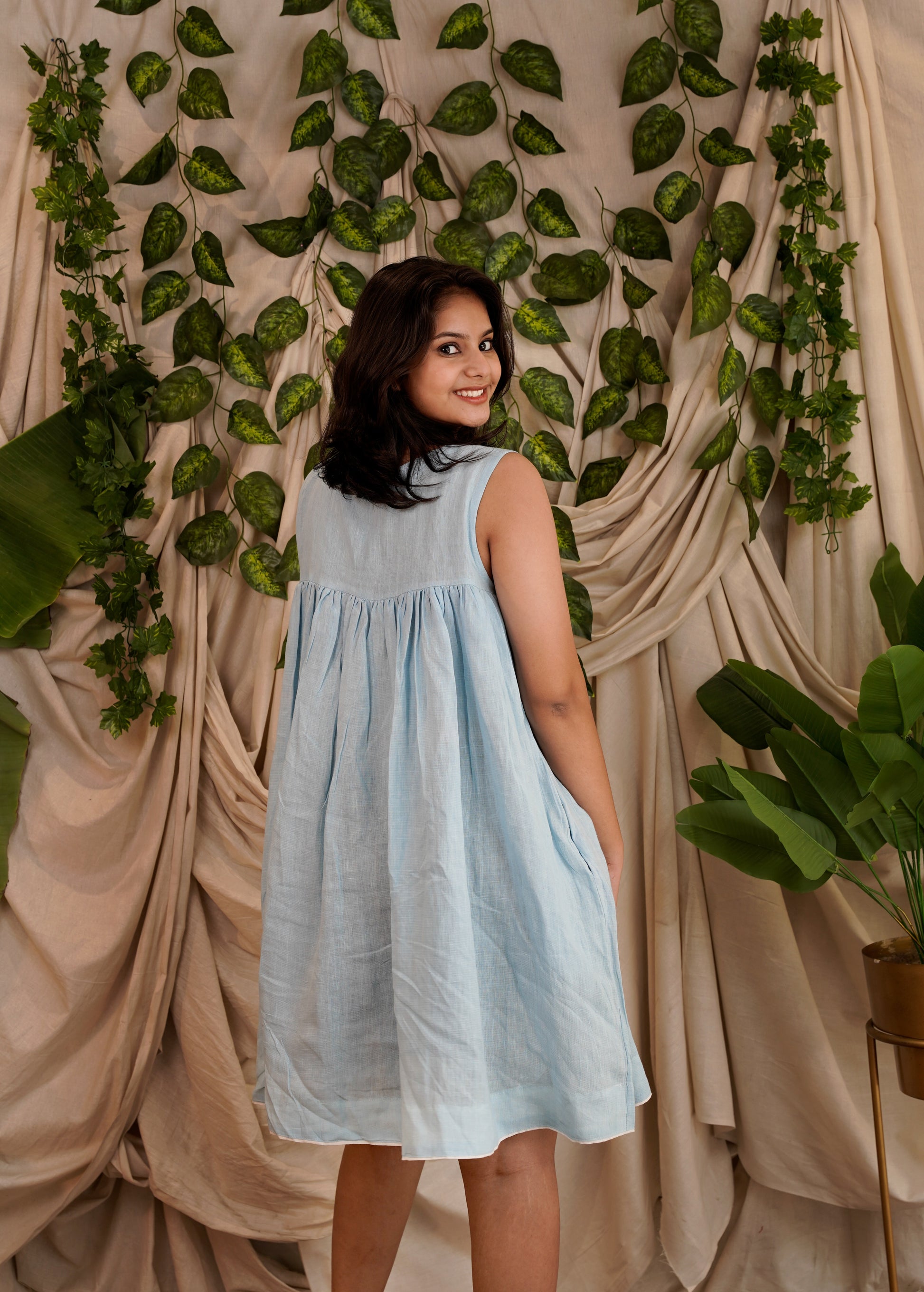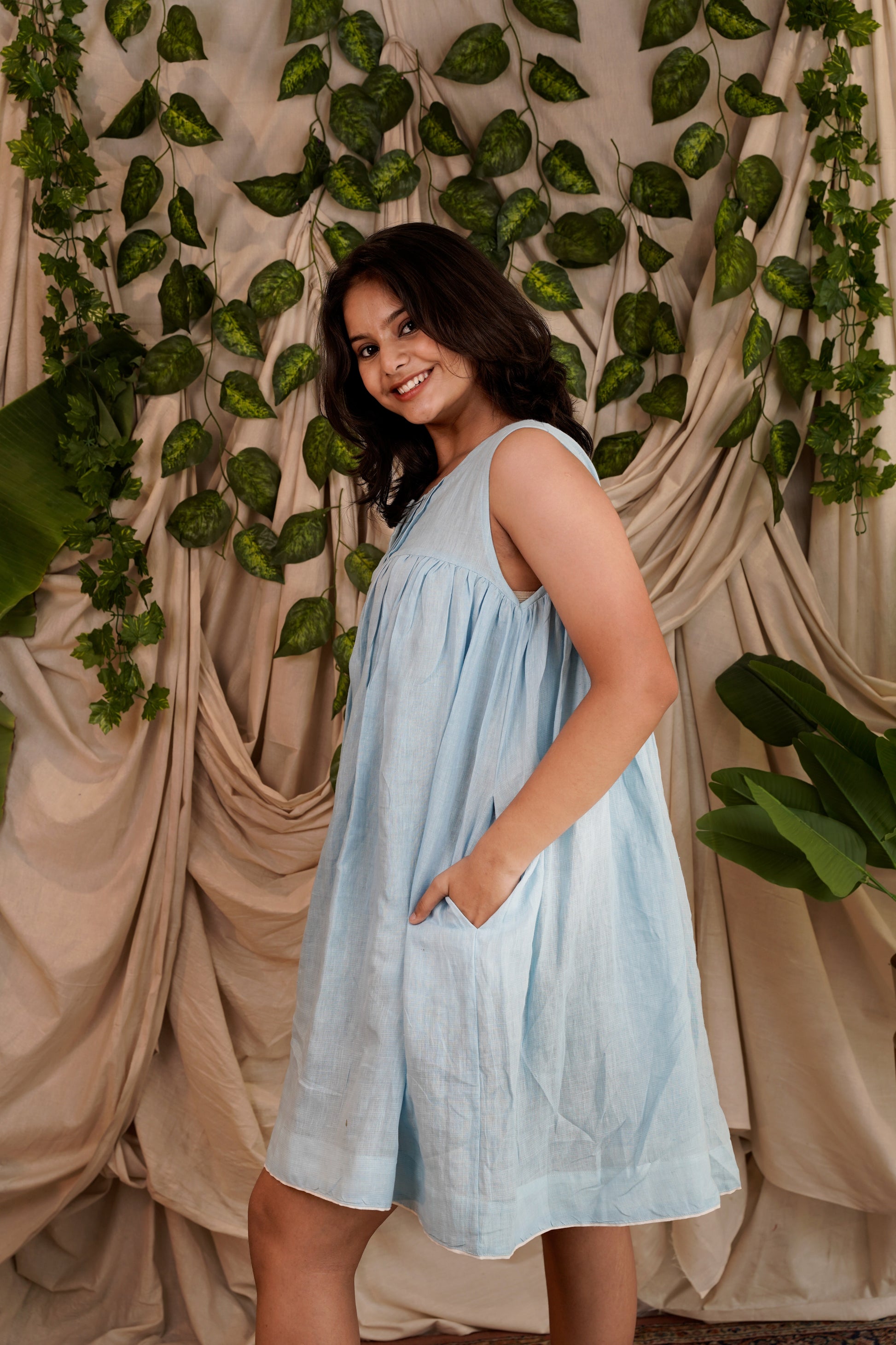 Embrace the refreshing charm of the Monsoon. This airy, sky-blue linen dress features delicate pin tucks and soft gathers, creating a flowy silhouette that moves gracefully with you. its light and breathable fabric ensures you stay comfortable while looking effortlessly stylish. Monsoon is an easy to carry tunic style dress that can also be paired along with pants or shorts because of its minimal yet versatile silhouette.