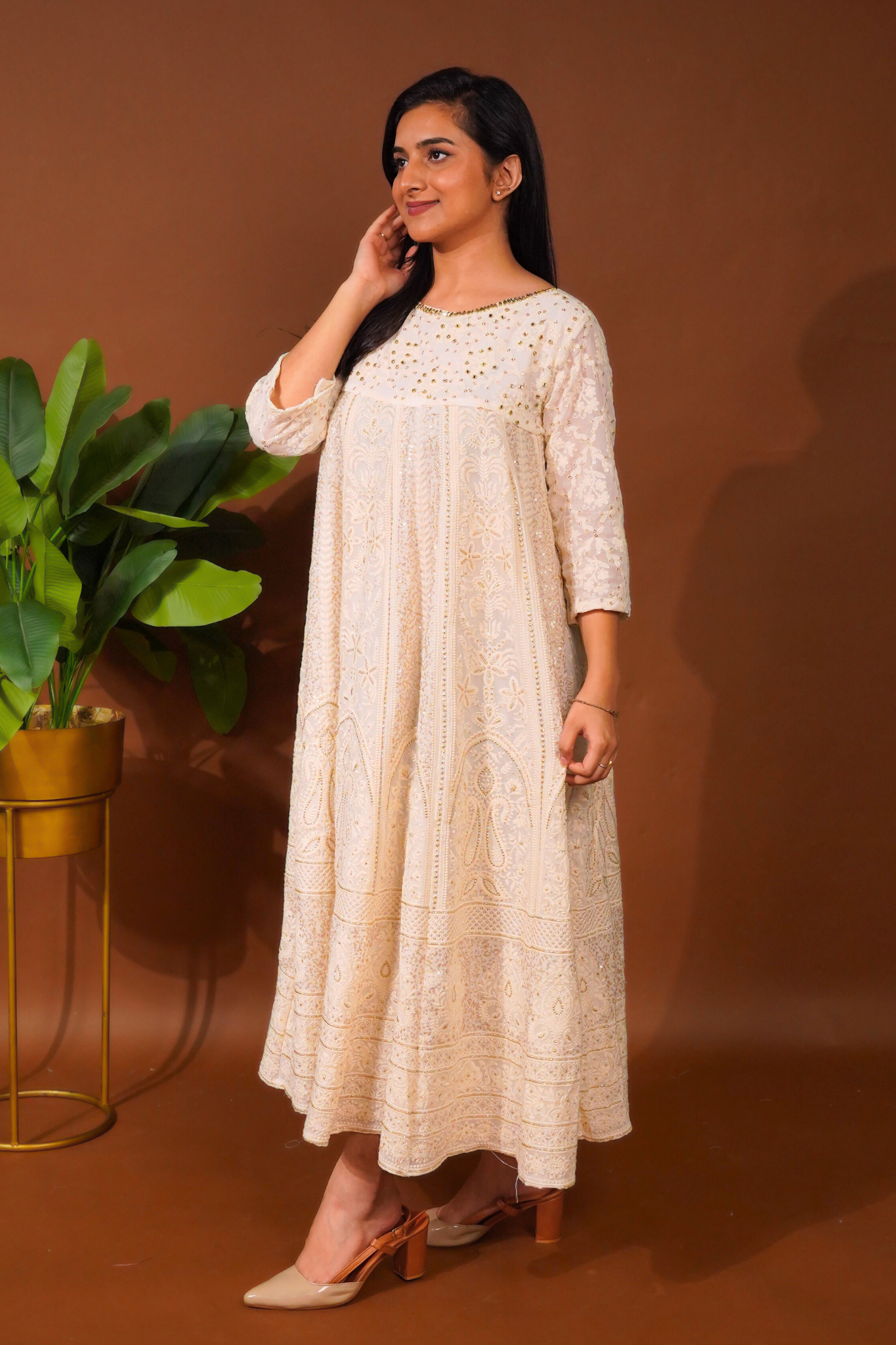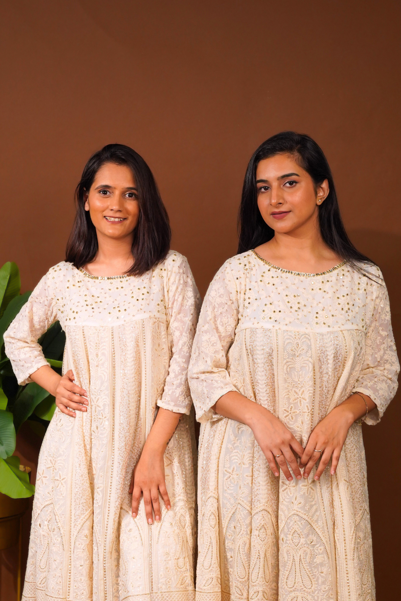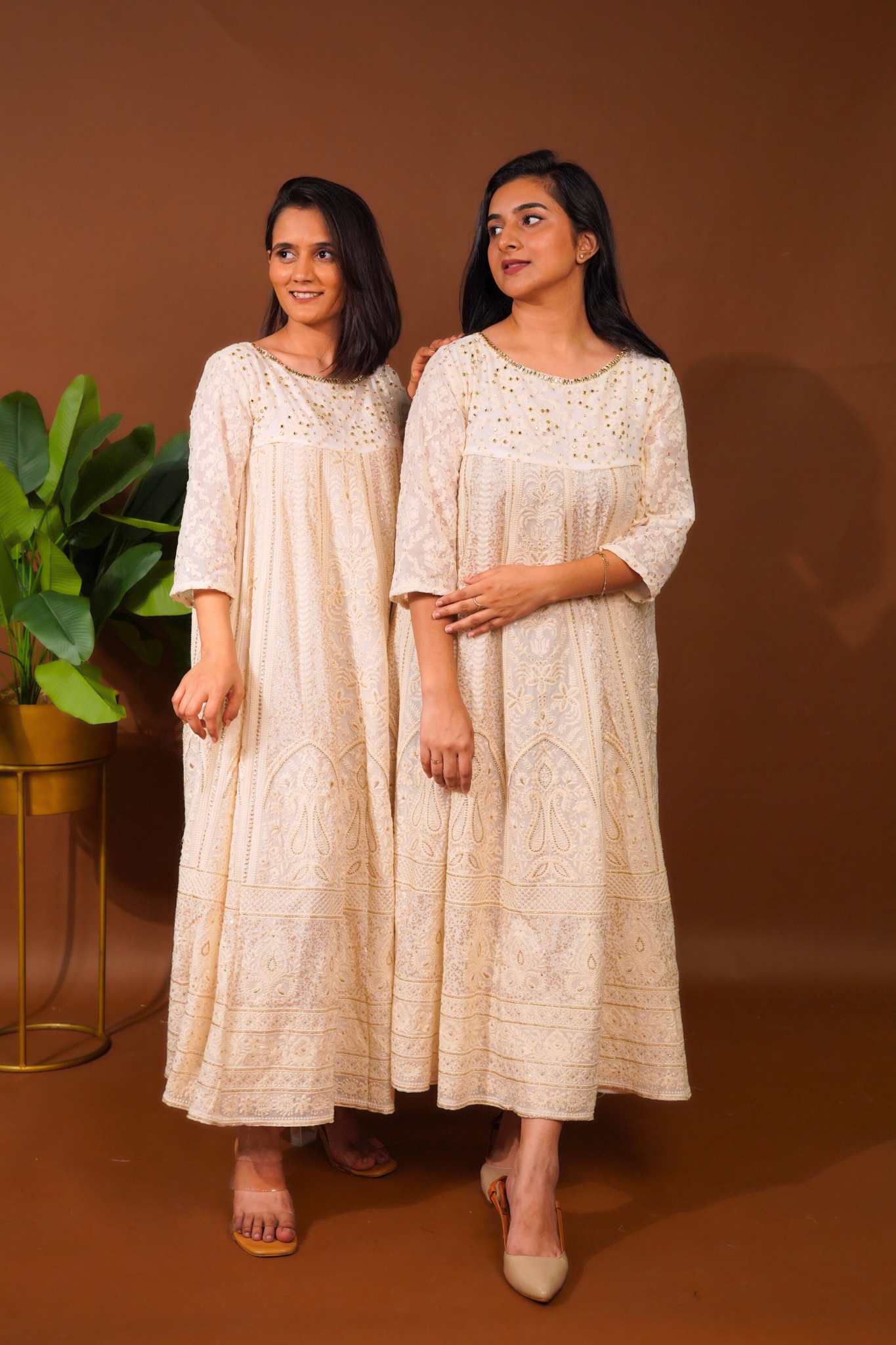 Gracefully crafted with intricate thread work, Nazm is an A-line silhouette that flows like a verse. Accented with delicate kiran lace and a luxurious brocade dupatta in hues of pink, this ensemble brings timeless elegance to every festive moment.