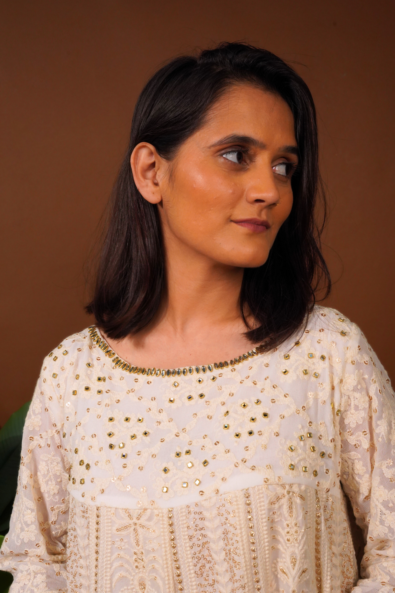 Elevate Nazm with traditional jhumkas and embroidered juttis for a classic festive look. Add soft curls and dewy makeup to complement its graceful charm.