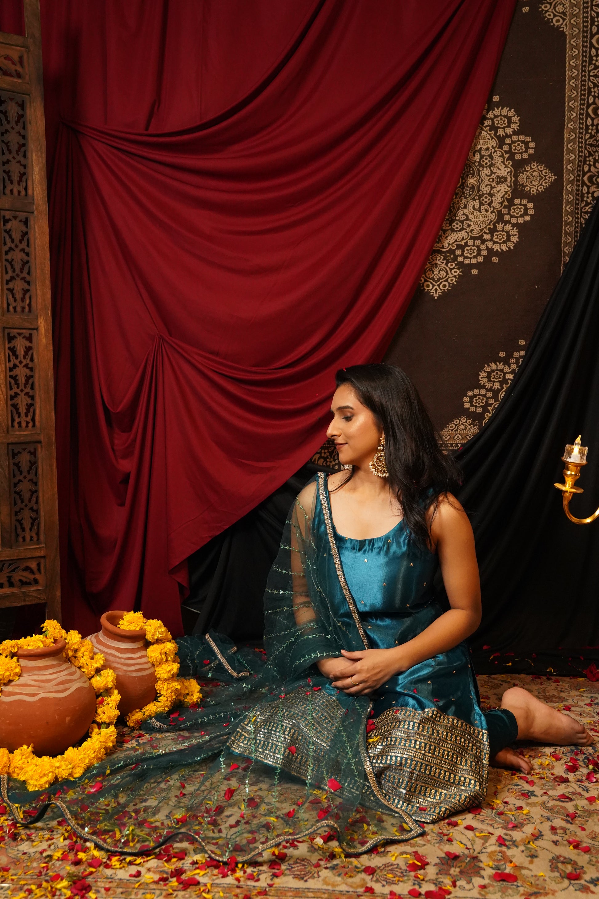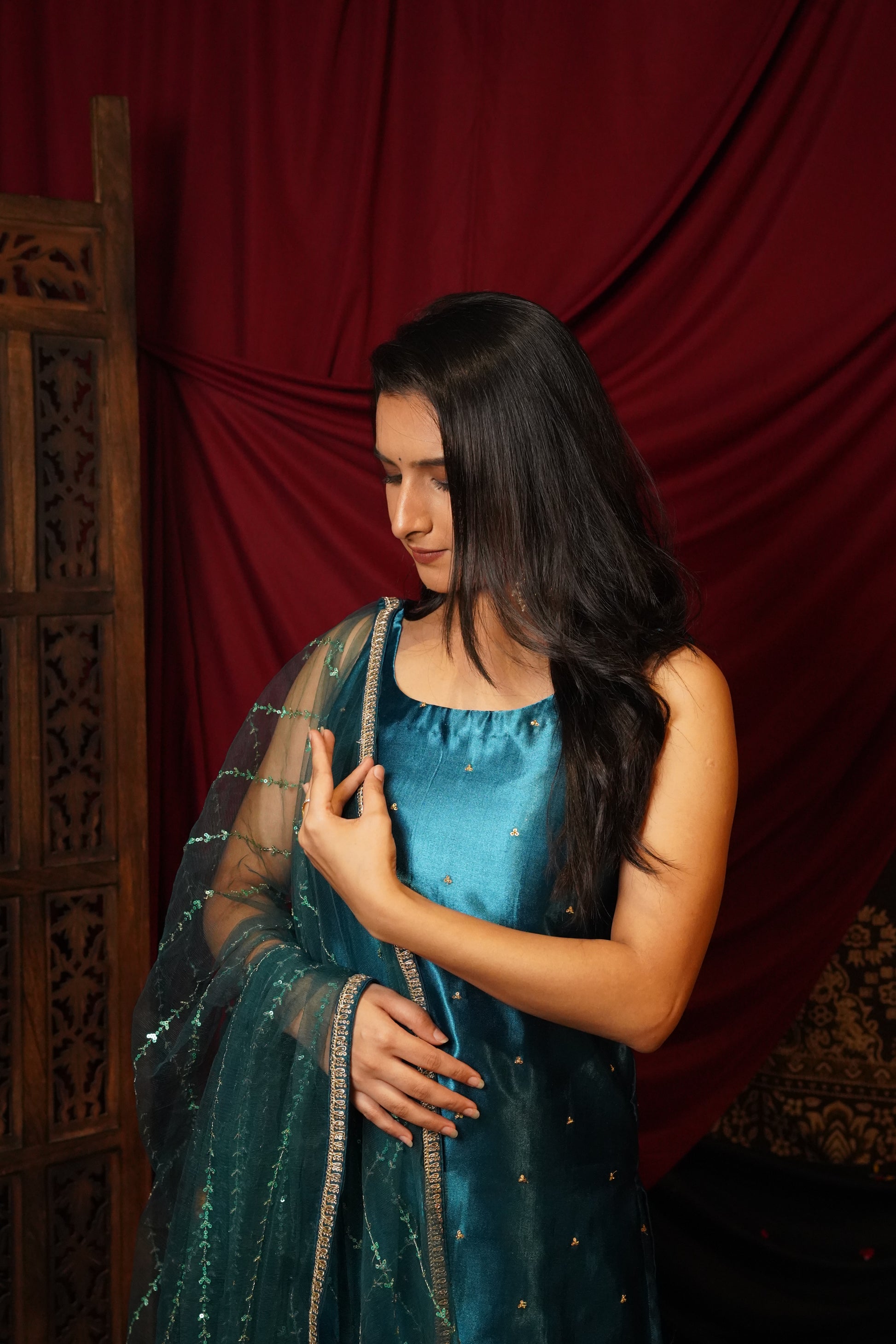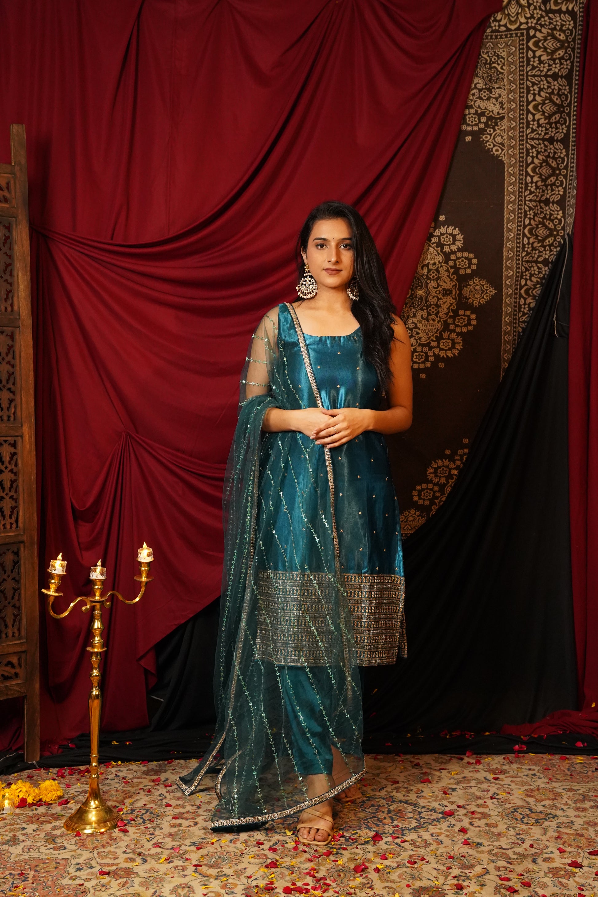 Embrace regal elegance this festive season with our Pehraav (Blue Body) Suit Set. In a rich teal blue, this ensemble features intricate zari and sequin work that adds a touch of luxury to every detail. The kurta, adorned with shimmering motifs, is paired with tailored trousers and a coordinating dupatta, each element crafted for grace and ease.