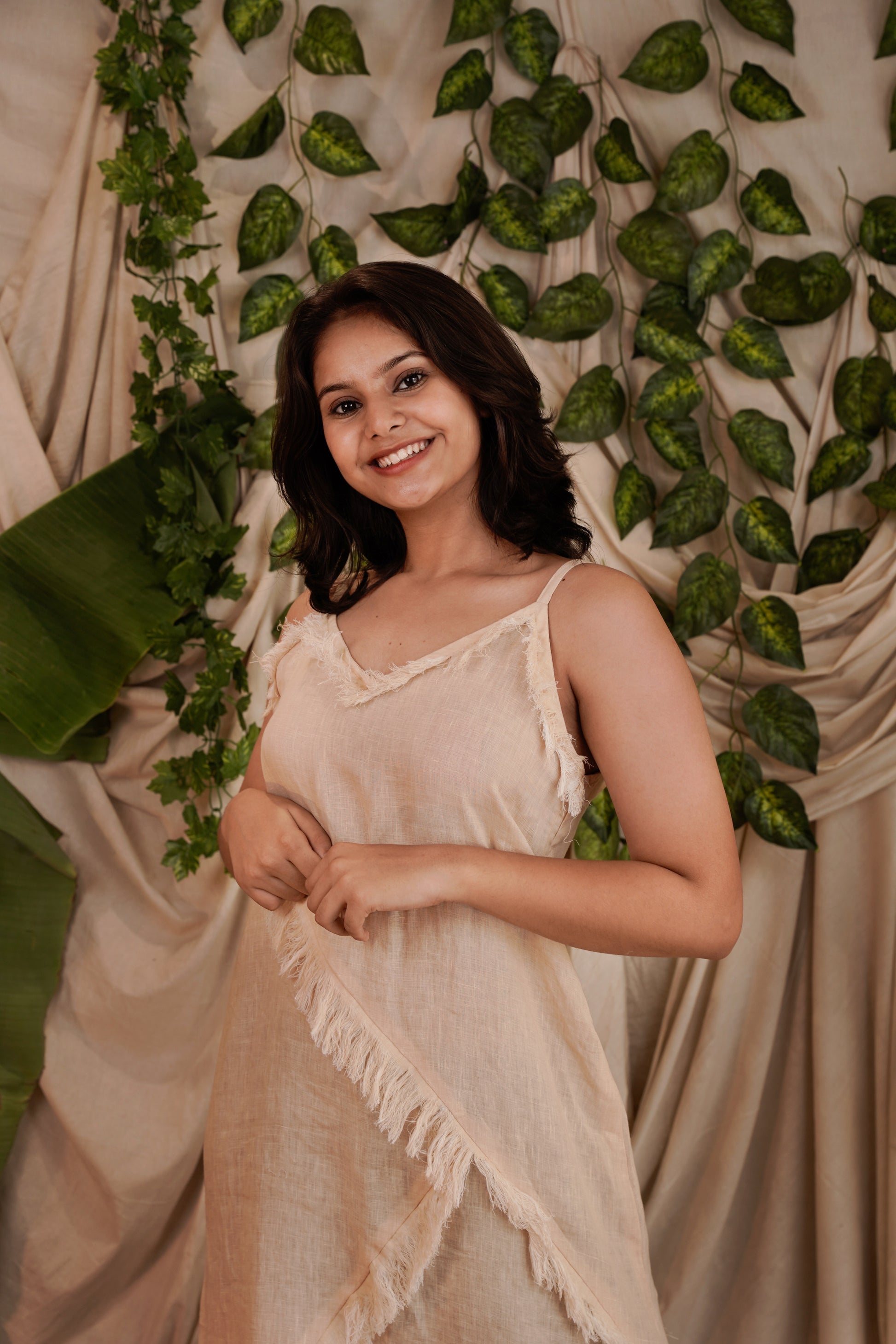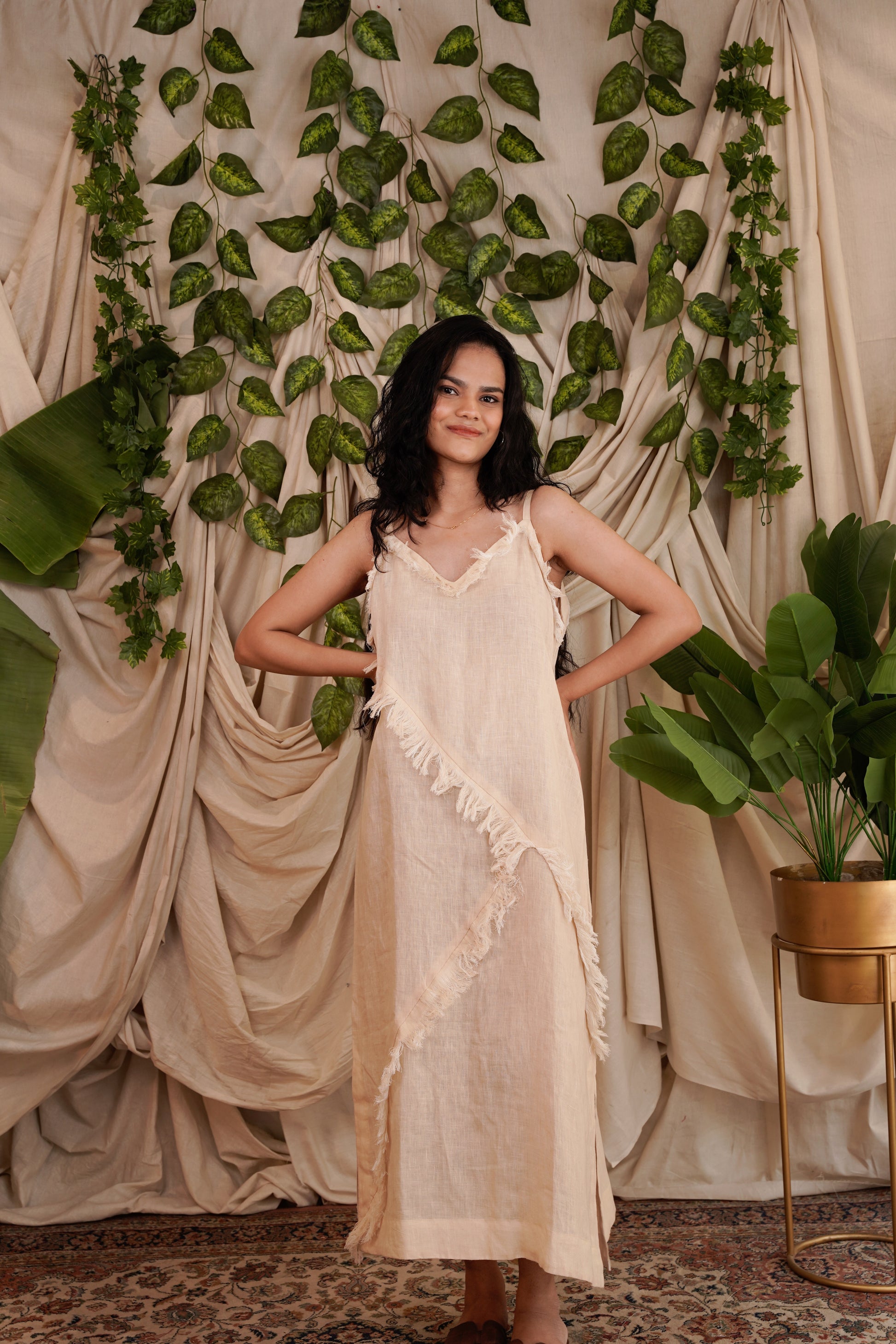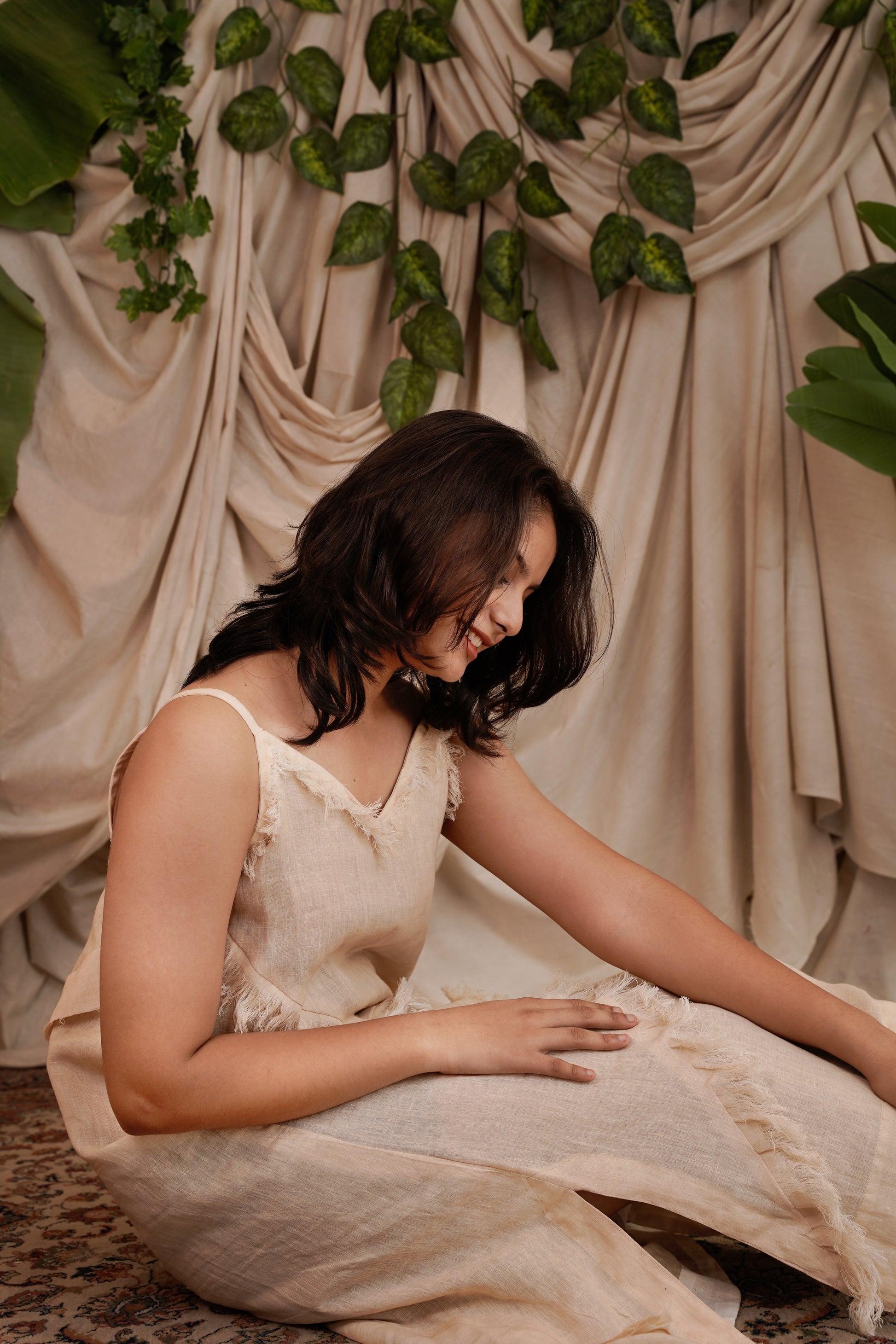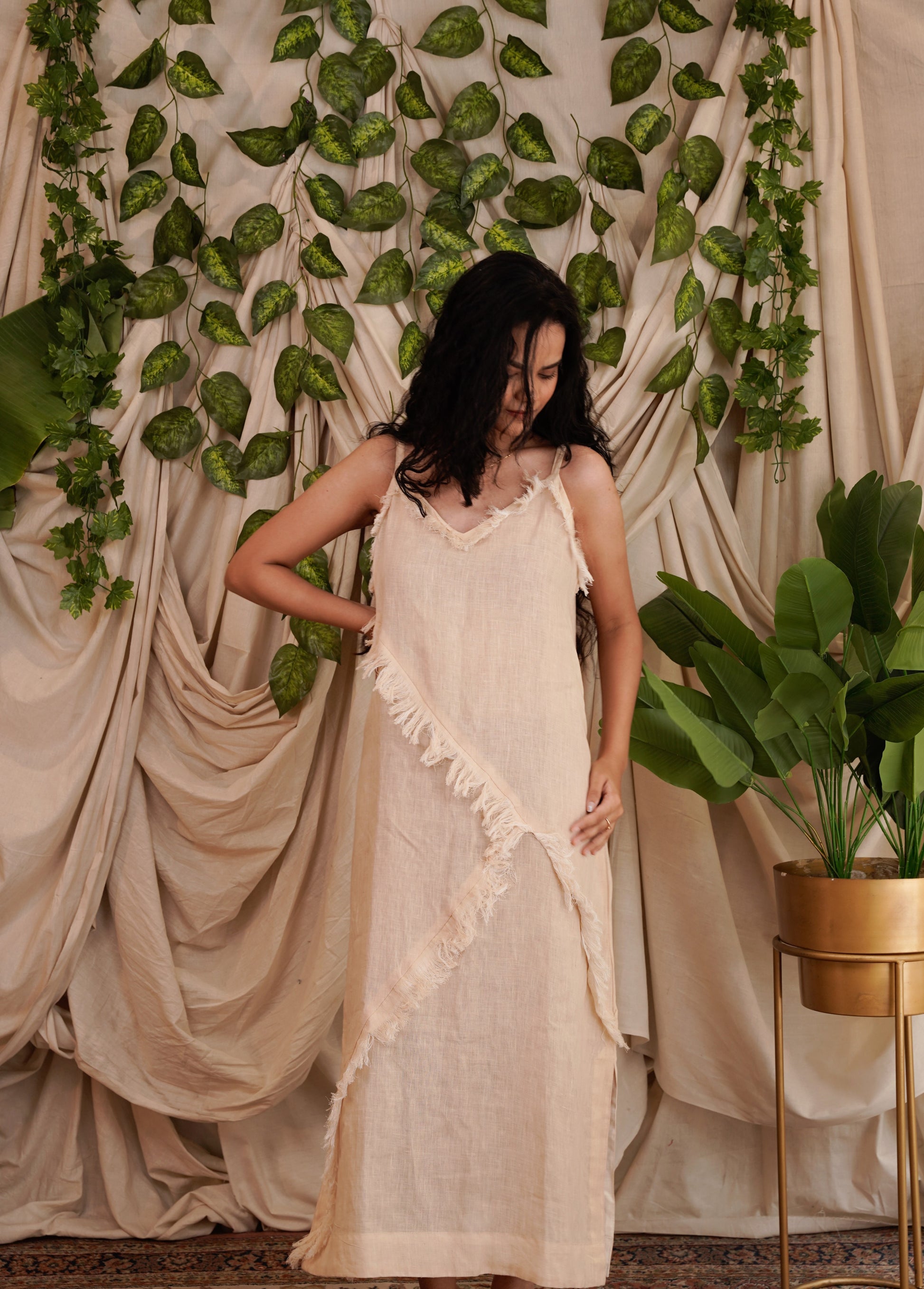 Experience the allure of effortless style with our Sand Dunes linen dress. Crafted from pure linen, this dress features delicate hand-crafted fringes made from linen thread, adding a unique touch to its elegant design. The flowing silhouette and V-neckline create a flattering, relaxed fit, perfect for warm, breezy days. Whether you're walking along the beach or attending a casual gathering, the Sand Dunes dress embodies natural beauty and sophistication.