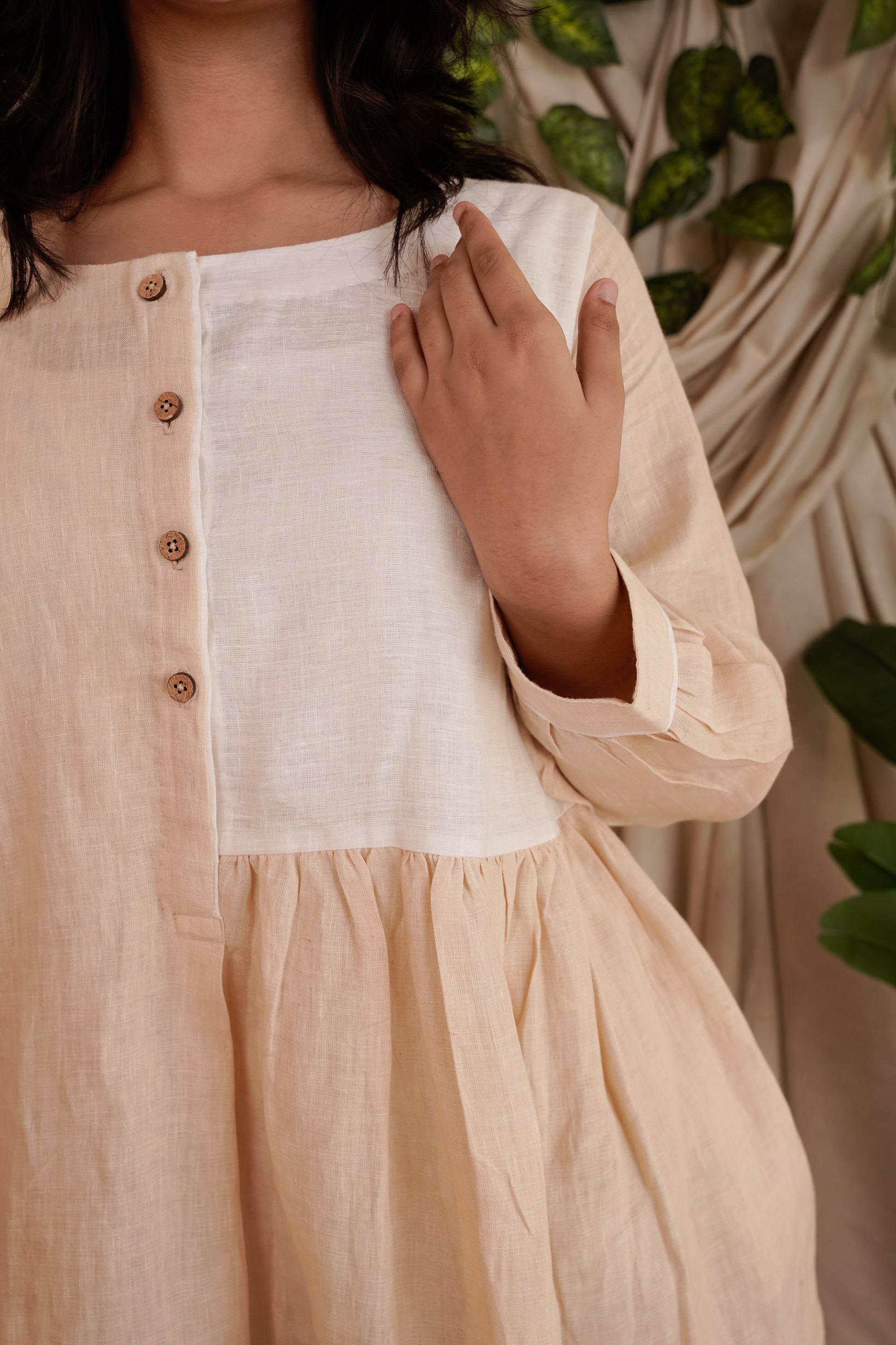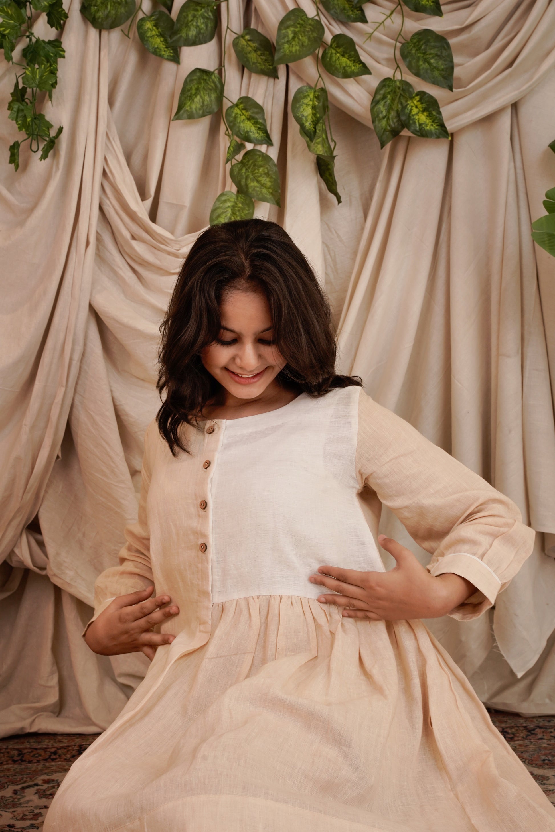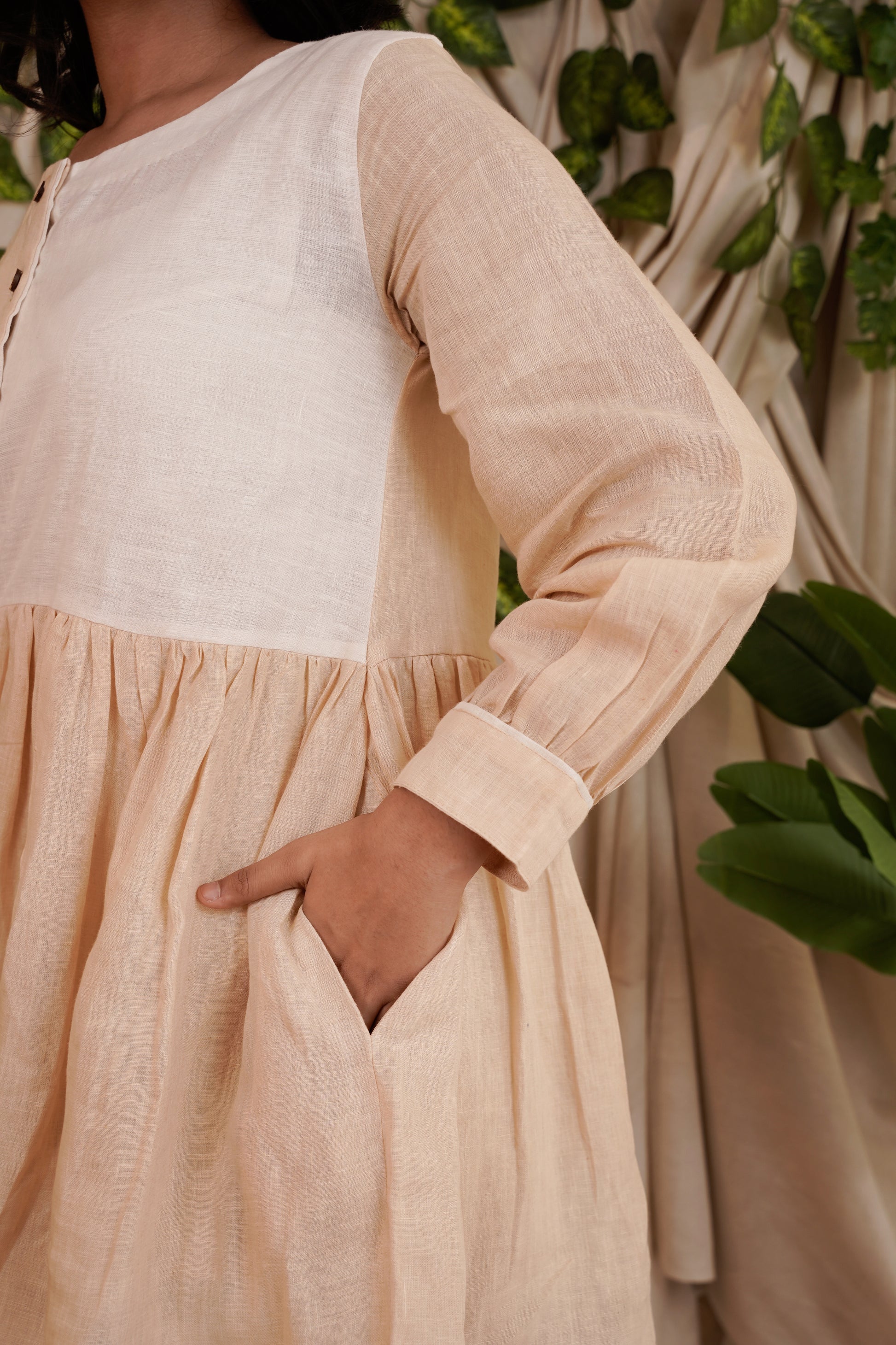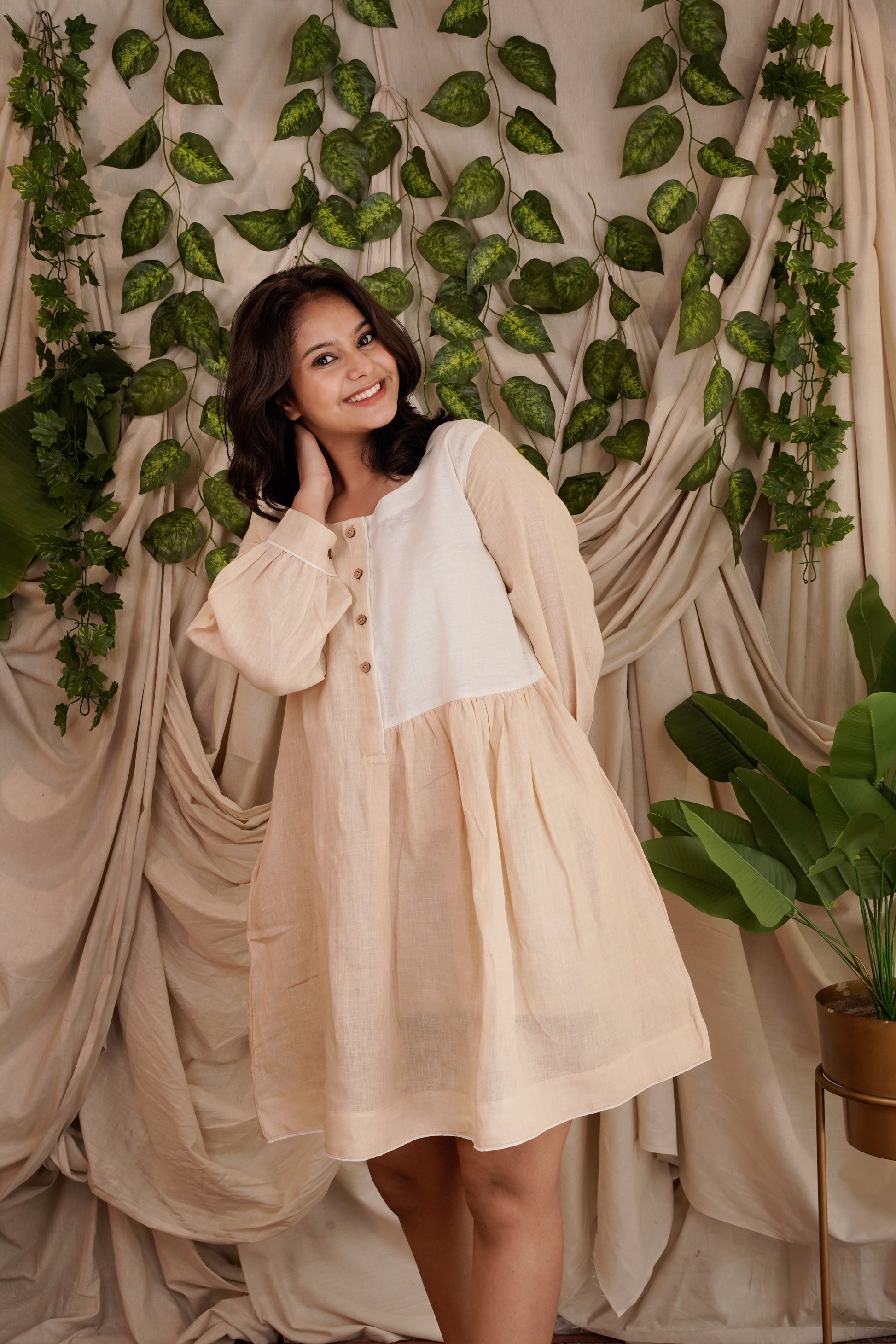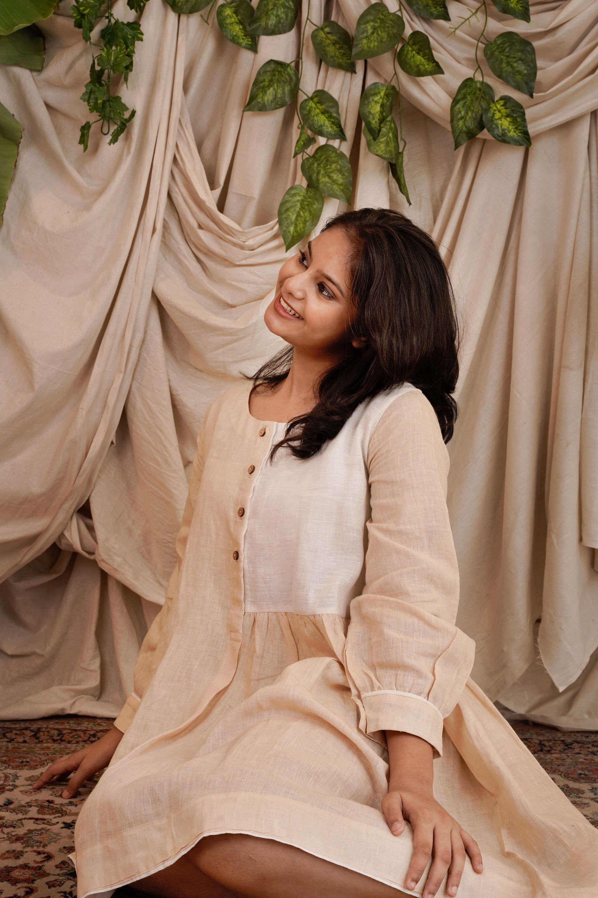 Embrace the perfect blend of comfort and beauty with our Sand and Shell dress. Made from lhand woven linen, this dress features a charming two-tone design with a subtle contrast between the sandy beige and shell white fabric. The button-down front adds a classic touch, while the long sleeves and gathered waistline ensure a flattering, relaxed fit. With convenient pockets, the Sand and Shell dress is ideal for any casual outing, offering both elegance and ease at one place just like a walk on beach with sand and shells.